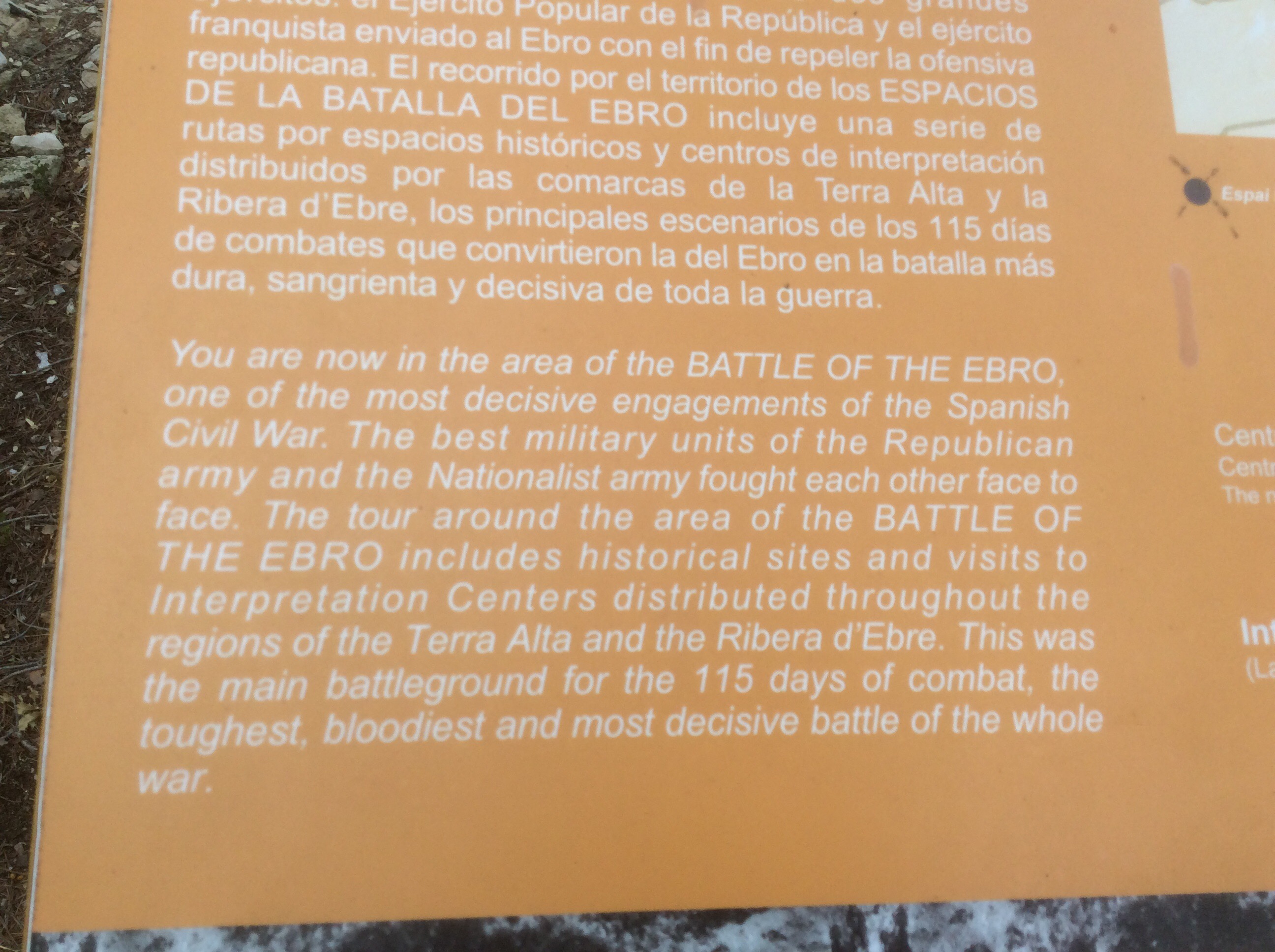 Reaching a main road that cut north to the road to La Fatarella, and into very emotional and historically-laden country. Eighty years ago during the Spanish civil war the Republican forces launched an overnight attack across the Ebro river, including Mora where we stayed last night. They surprised Franco’s forces and pushed up the way we are heading towards La Fatarella. Young lads from Spain, reinforced by international brigades from the UK, other European countries and the USA fought the might of fascist Franco, supported by Hitler and Mussolini.