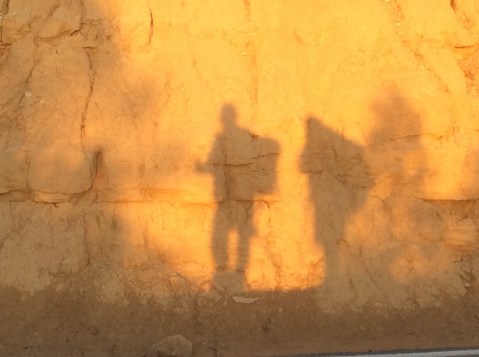 The sun was then going down as we gritted our teeth for the last uphill 17 kms and a swift downhill 3 kms drop to Nonaspe. Our shadows were great against the warm stone.