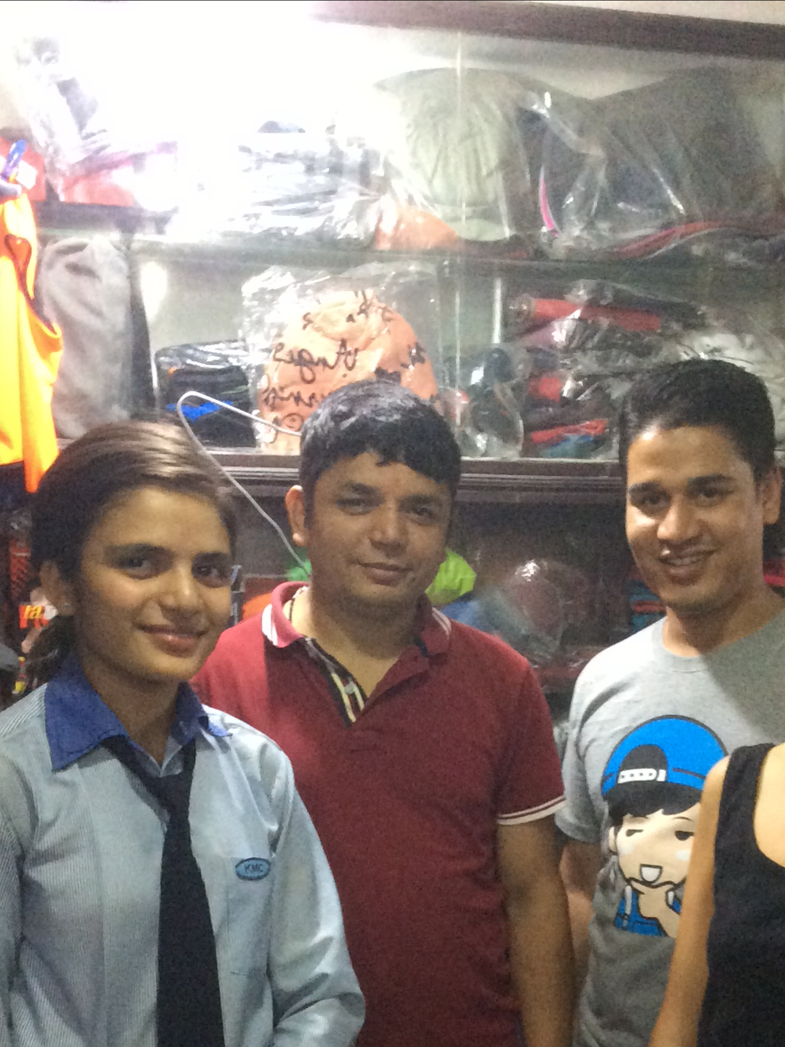 We slept well, breakfasted and a ‘fixer’ turned up at 11am, pre-arranged by our trekking company, and we were accompanied to a money change shop, which doubled as a trekking equipment emporium. We brought dollars, paid the trekking company in cash and exchanged most of the rest into rupees. We then bought some water bottles from the emporium and took a photo of the shop assistant, money changer and fixer, in that sequence from left to right.