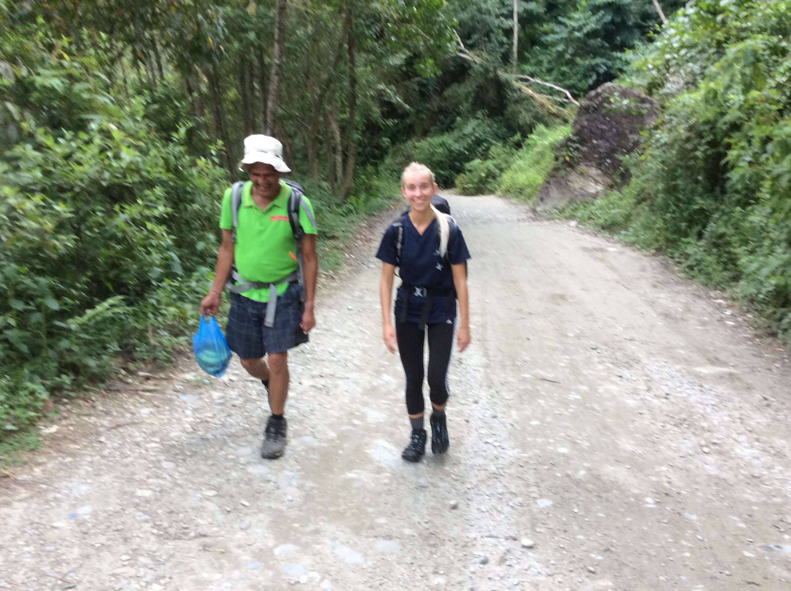 On foot with our rucksacks we followed a footpath down to the river and up to a very, very rough country road. This is Jetty with our guide.