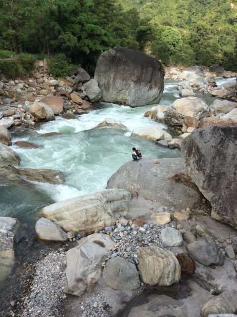 There were some lads fishing in the torrent underneath for tilapia, and according to Prem the cold water of these rivers produces very tasty fish. One slip and they is gone.