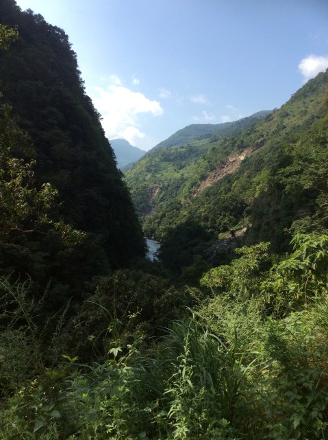 The track slipped down to the river and across a decent bridge, before cutting up steeply along the mountainside. It felt like we were climbing higher and higher above the river but the valley is so narrow and steep in this section that we were actually just keeping pace with the rise in the valley floor. It was getting hotter and hotter. My pack felt heavy and I was sweating like an old bloke sweating a lot. But it was heavy and it was tough following the track. Almost immediately we came across major landslides. Some of these had been cleared but some were so substantial that they had dragged the road down the mountain and we had to climb gingerly round what was left, with near vertical drops down to our raging river. And one was so massive that there wasn’t much left of the mountain side or the road for a hundred metres.