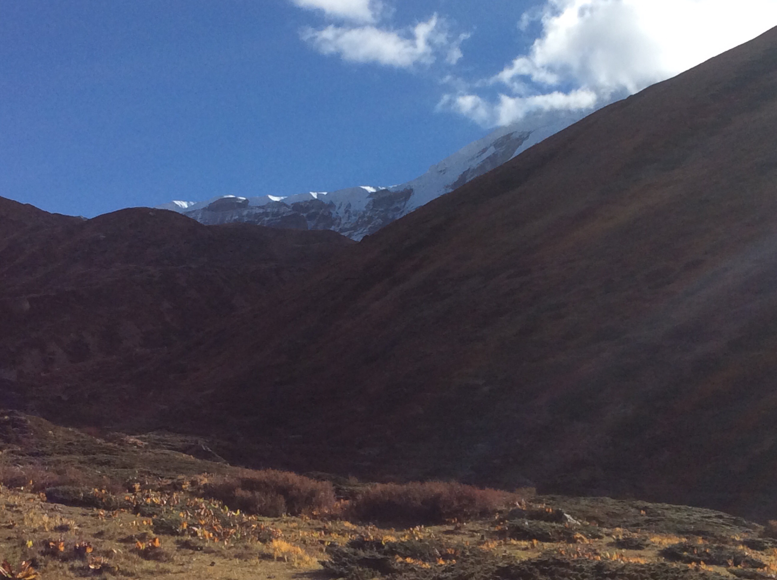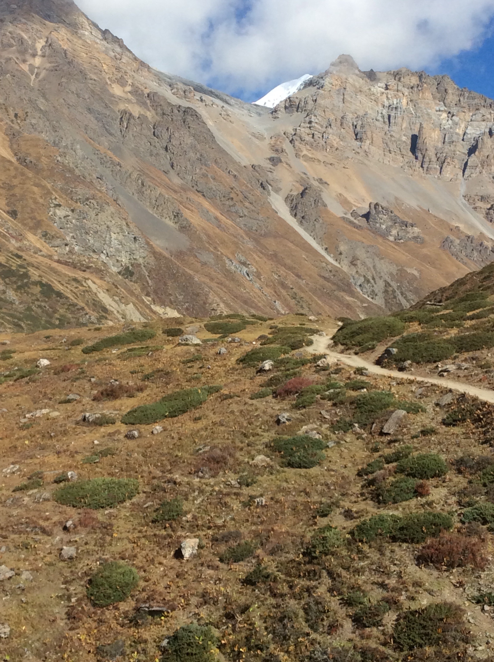 Looking back the valley was cultivated and civilised, and the big peak of Dhualagiri nestled in the clouds. For years it was considered to be the highest mountain in the world but is really the 7th highest. Notorious for avalanches, and we were unaware of what happened on a lower peak below it during the night, with 9 poor souls being wiped out in their sleep by an avalanche. We had heard of two people copping it in an avalanche a couple of weeks ago and at the same time five people going over the edge of a ravine in a jeep, including two Aussies, all dead. It’s a phenomenal place but bad luck is a killer here.