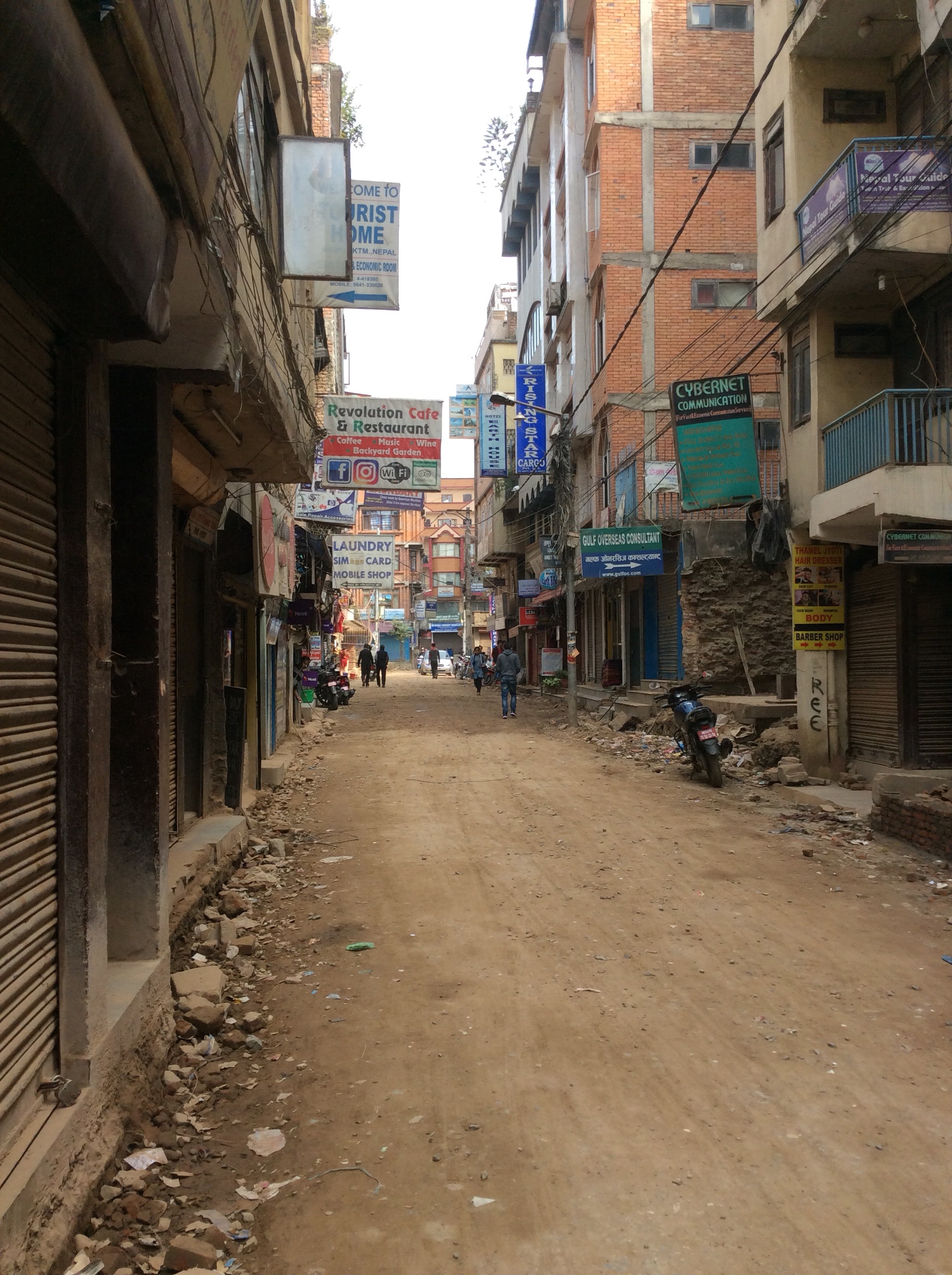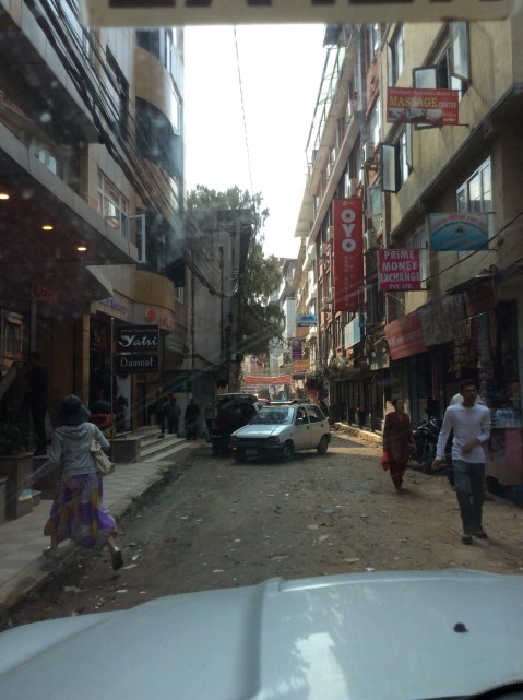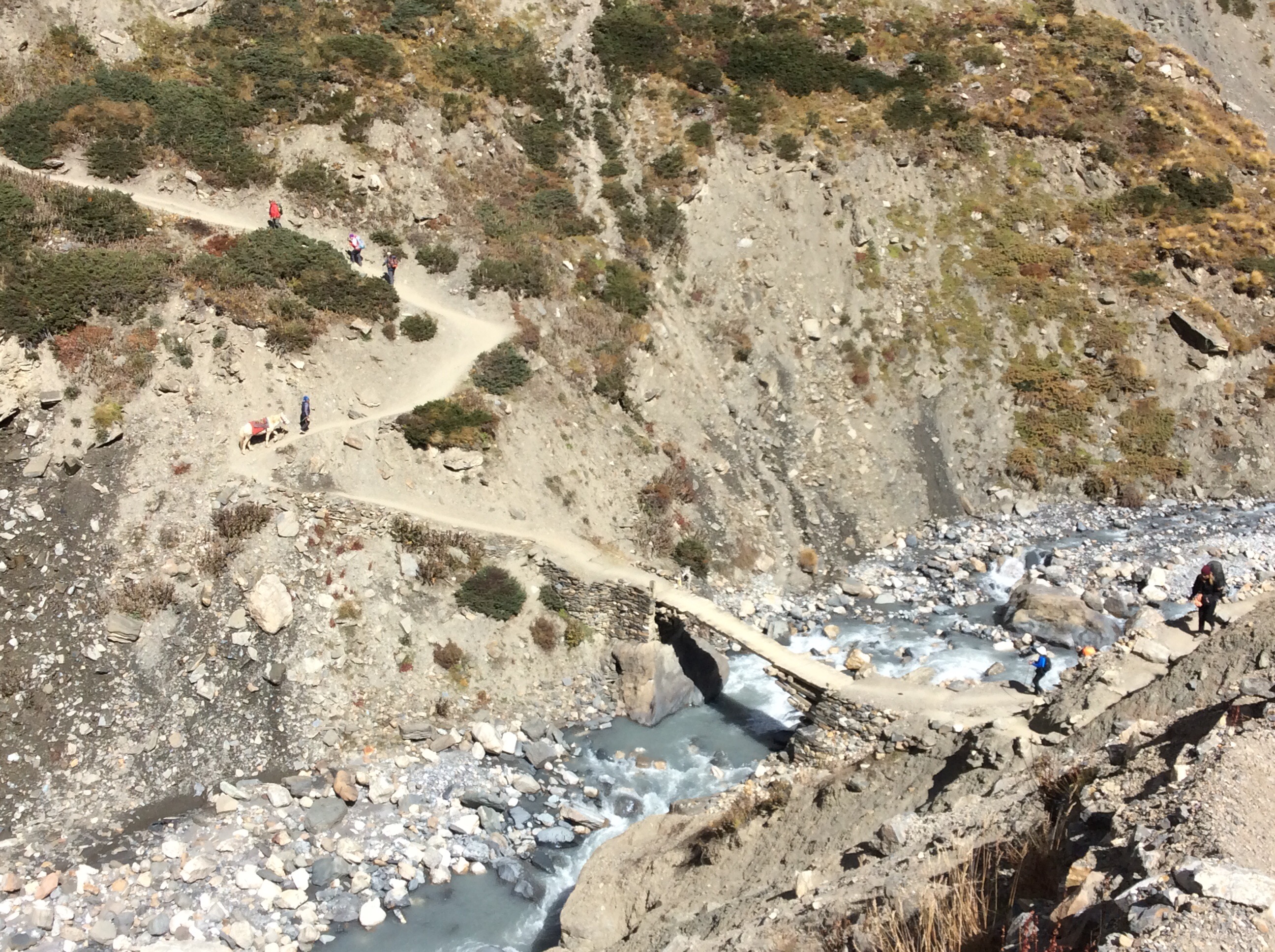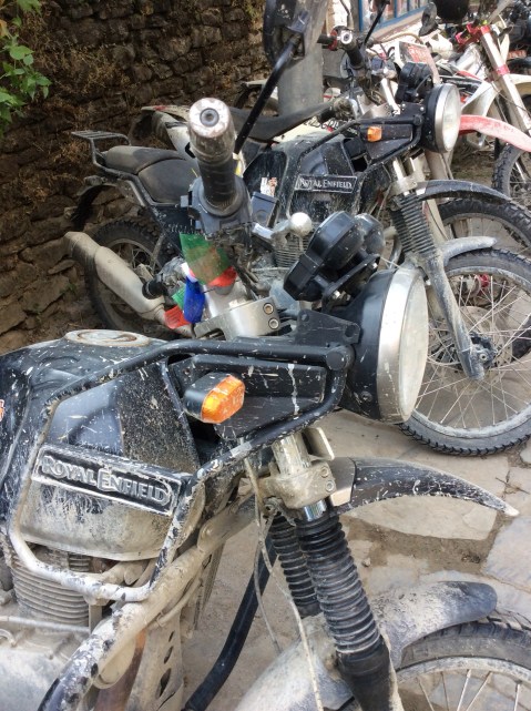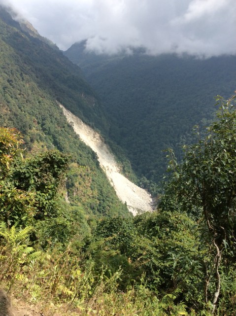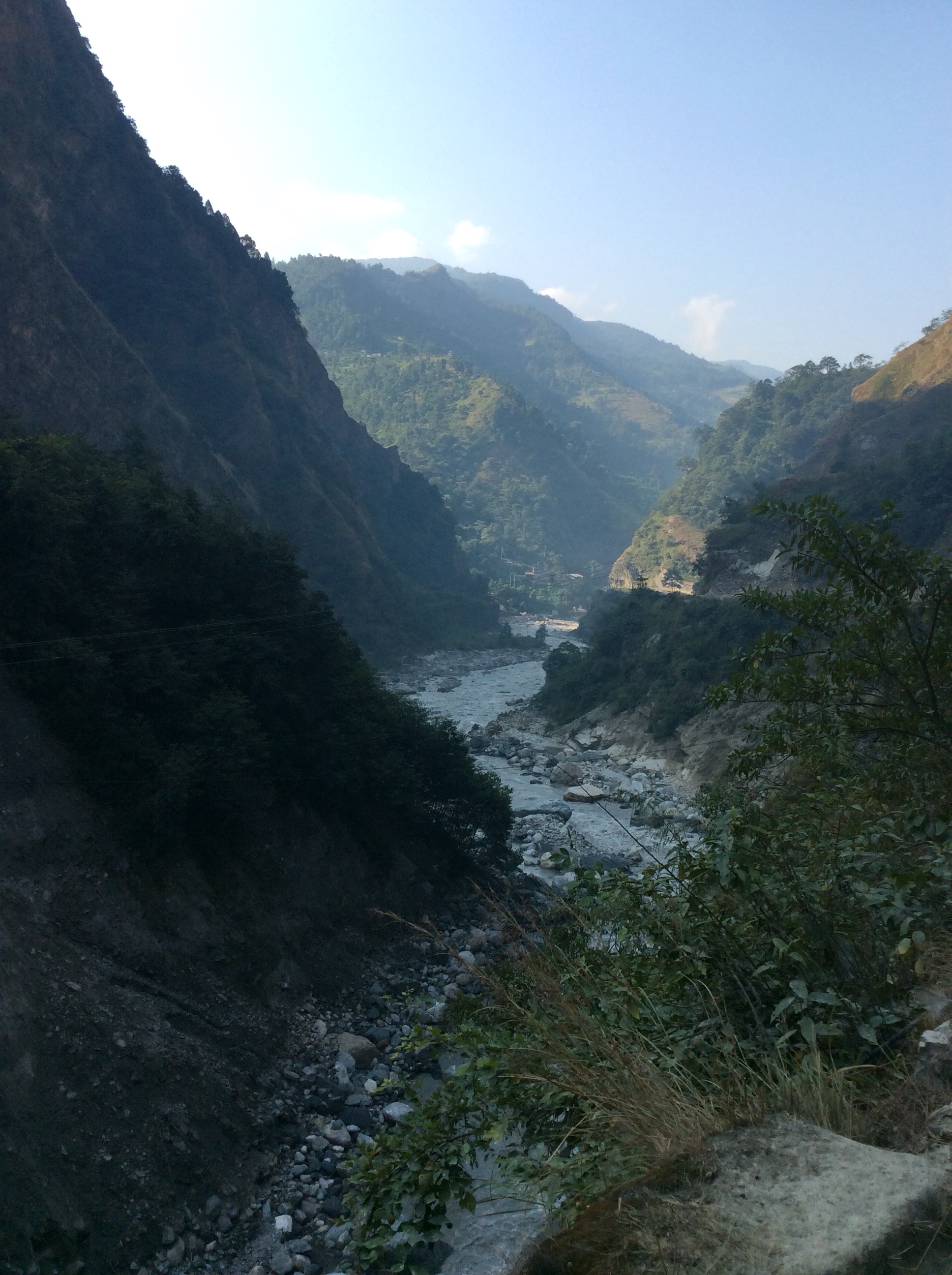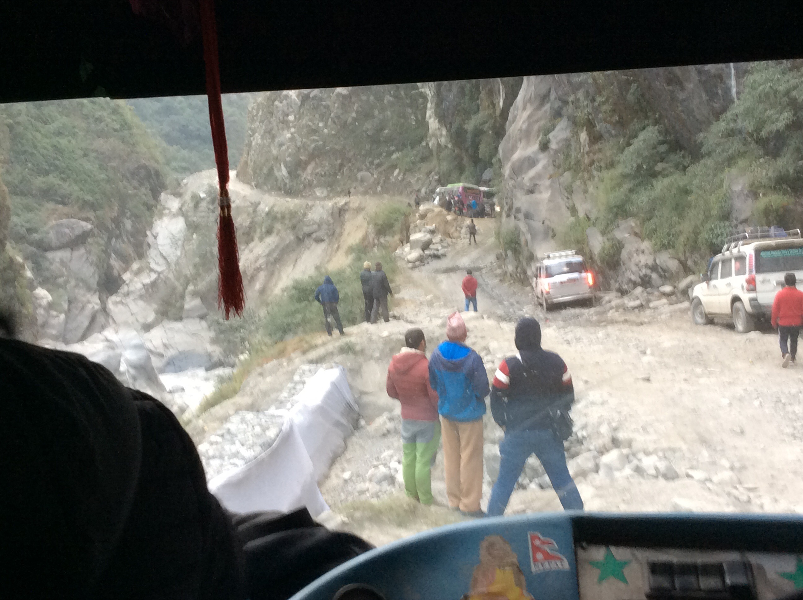The road was just bulldozed out of the mountains and was a mass of boulders, mud and dust, with no surface at all. There were multiple landslides which had crashed through it and streams that splashed across it. The road clung in places to the side of one of the highest ravines in the world (there are many of these superlatives in Nepal). Jet used one – worst experience of her life.