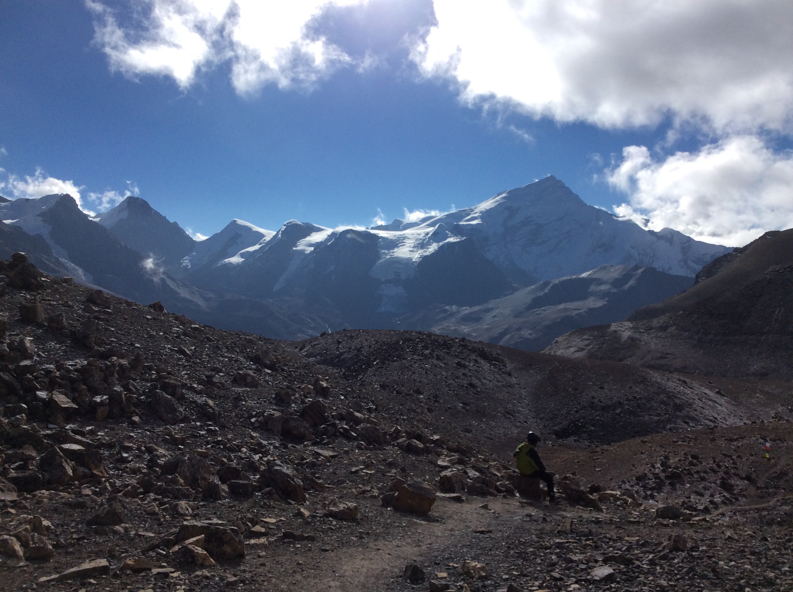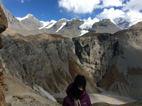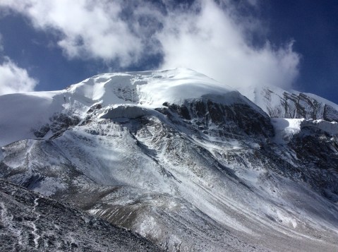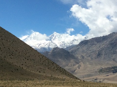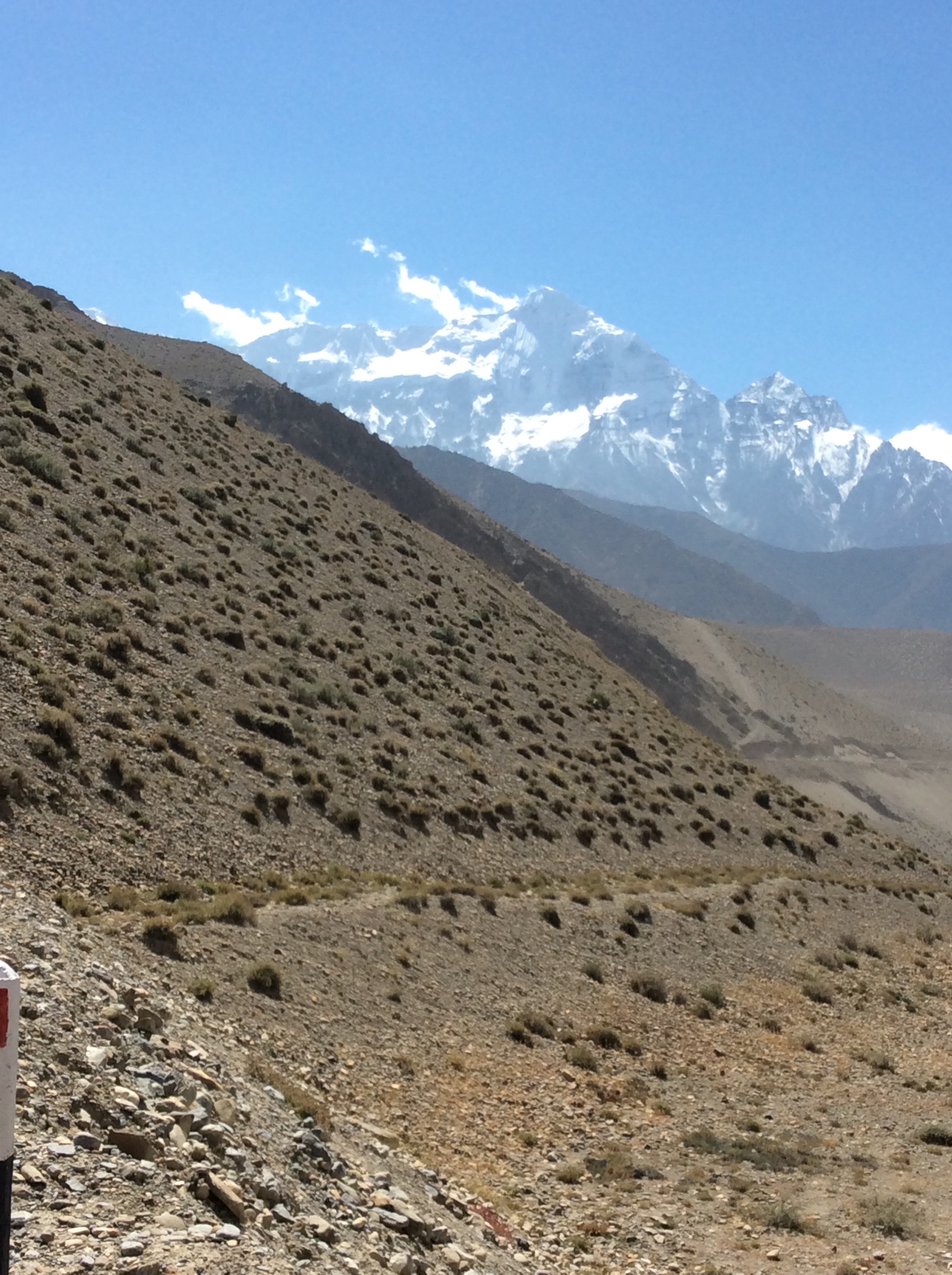 The summit of the highest pass in the whole frickin world. 17,769 feet. We’d done it! Starting to drop down the other side into the Mustang region the mountains either side of the pass were close and impressive, with glaciers hanging over the edge of sheer drops.