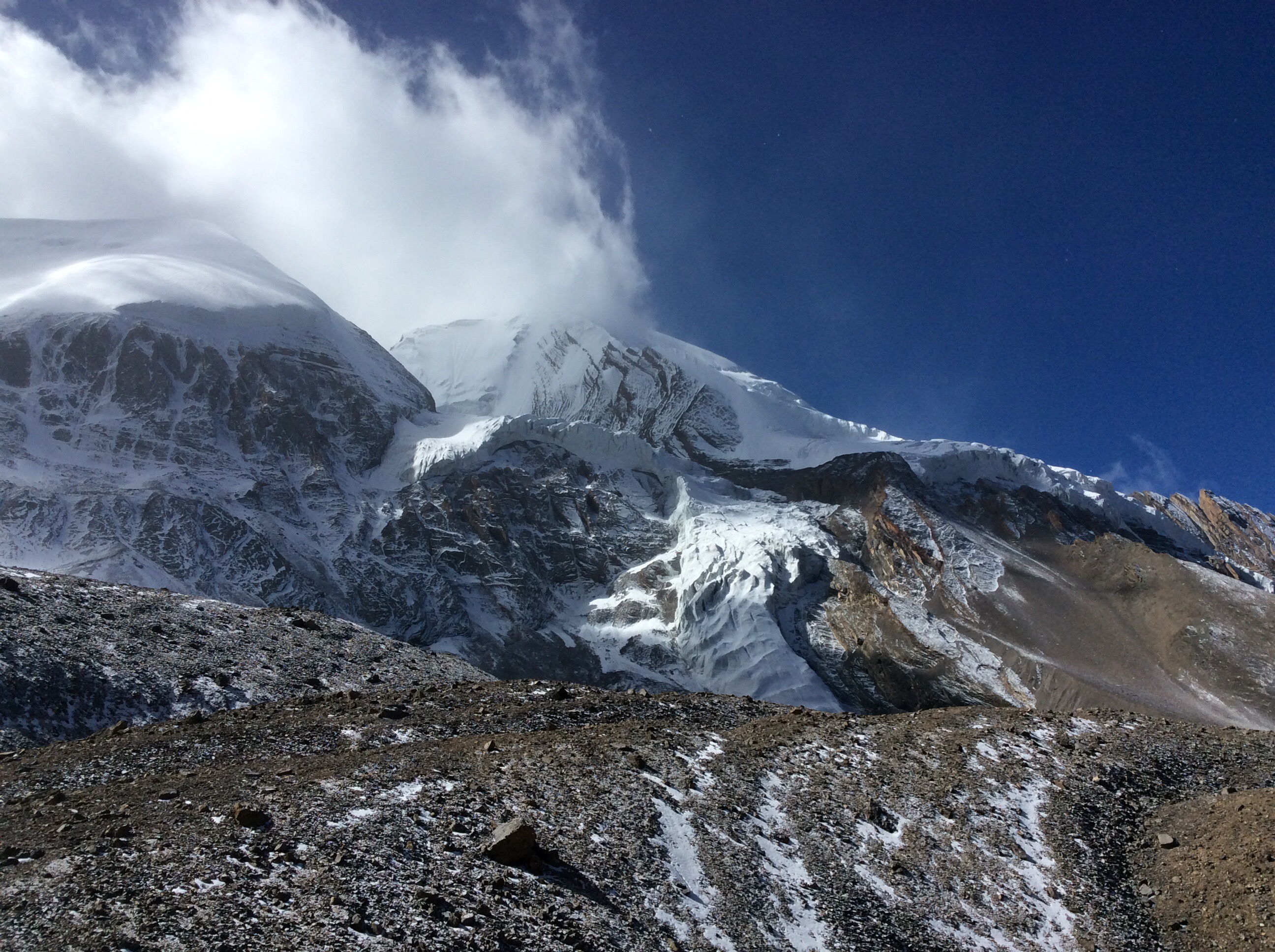 The sun was beginning to make an appearance and created some gaps in the clouds. Showing Annapurna South to the right and Gangapurna behind to the left. It was more than a week ago since we were climbing up the other side of Gangapurna to the bottom of its glacier from Manang.
