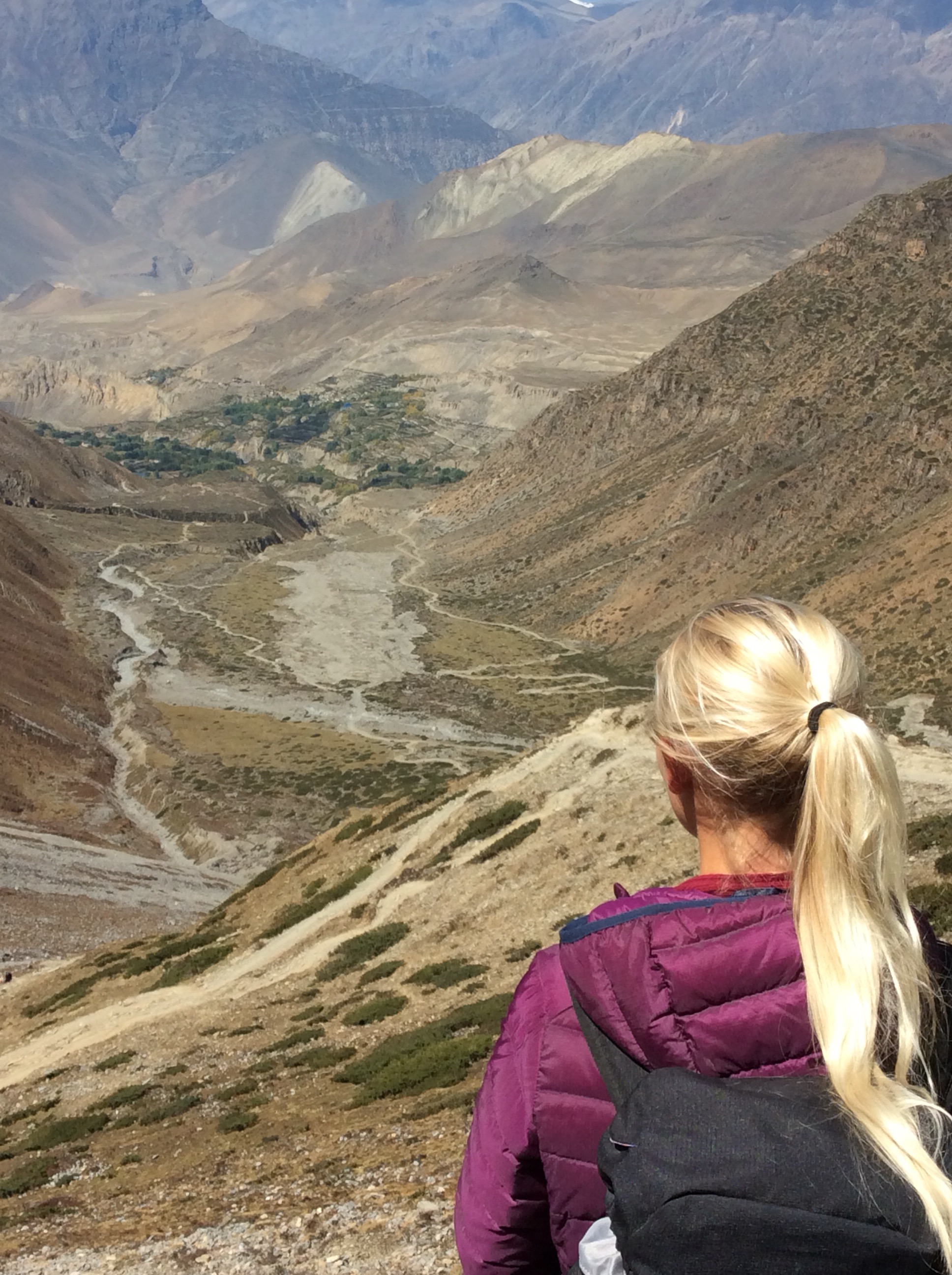 Looking forward the path dropped down to Muktinath in the green oasis and beyond into the Mustang valley.