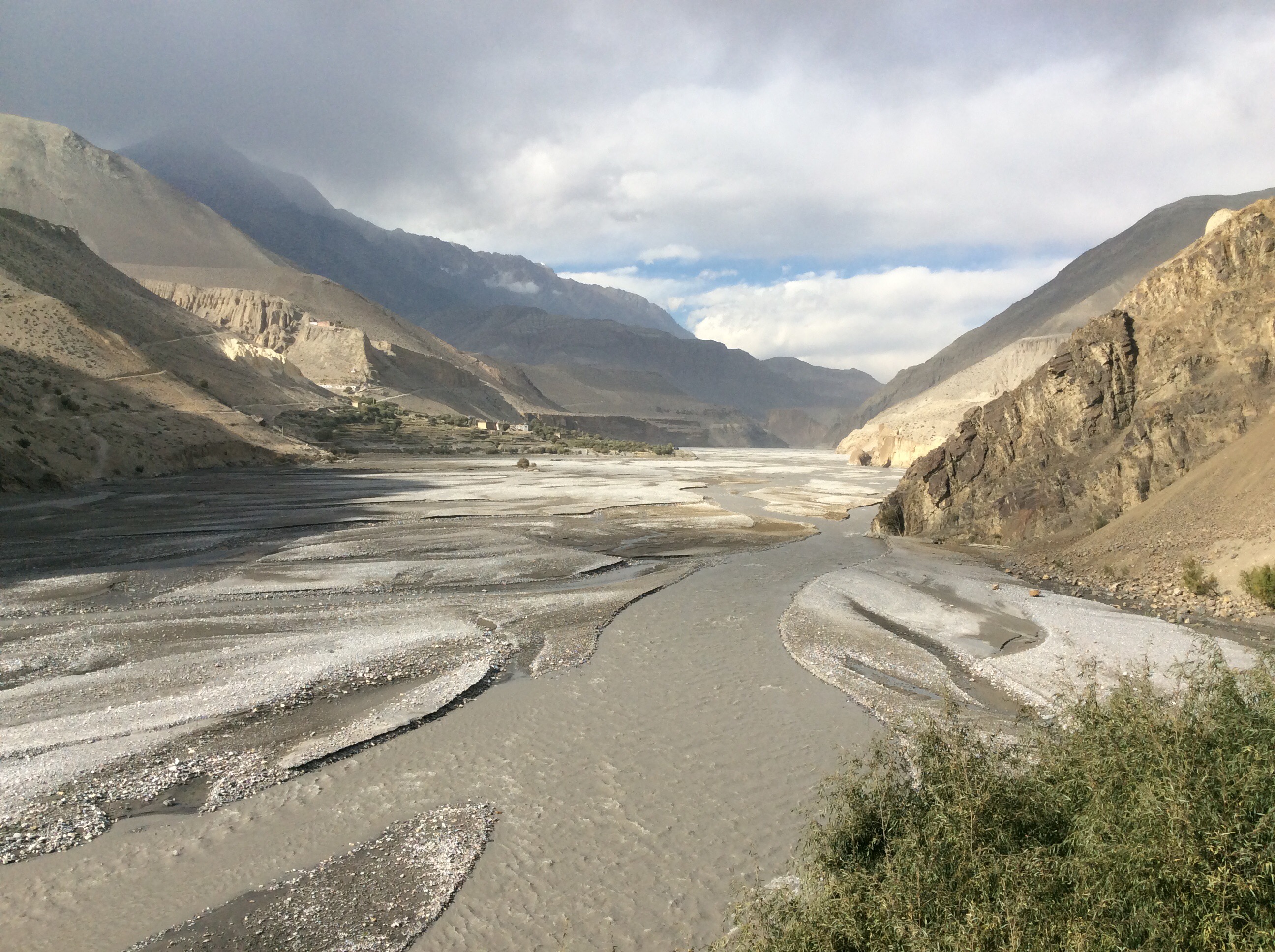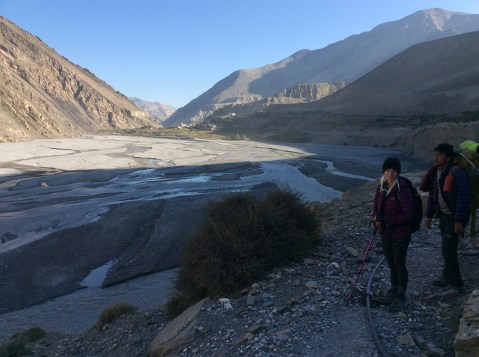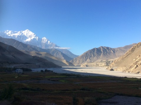 At this lower altitude, around 9,500 feet, walking was easy, the air wasn’t thin. Looking back upriver the Mustang valley was broad and stony, with Kagbeni just above it in the middle
