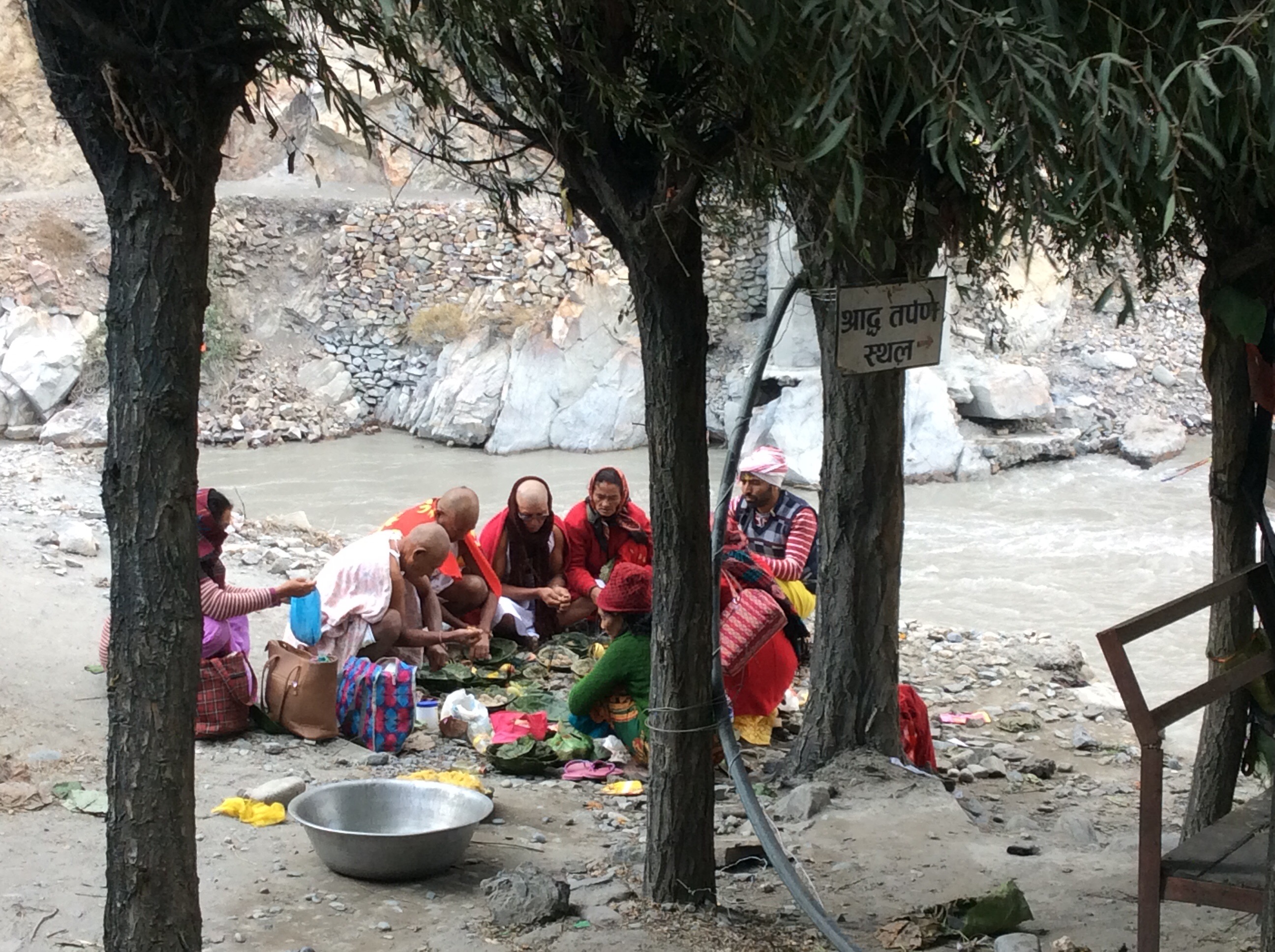 The river that runs past the village becomes the Ganges and is the holy river. Pilgrims to Muktinath stay here en route and undergo death ceremonies where they pay tribute, with holy men, to their deceased relatives. This photo was taken after the guide (a Hindu himself) confirmed that it would not be irreverential. This is a death ceremony.