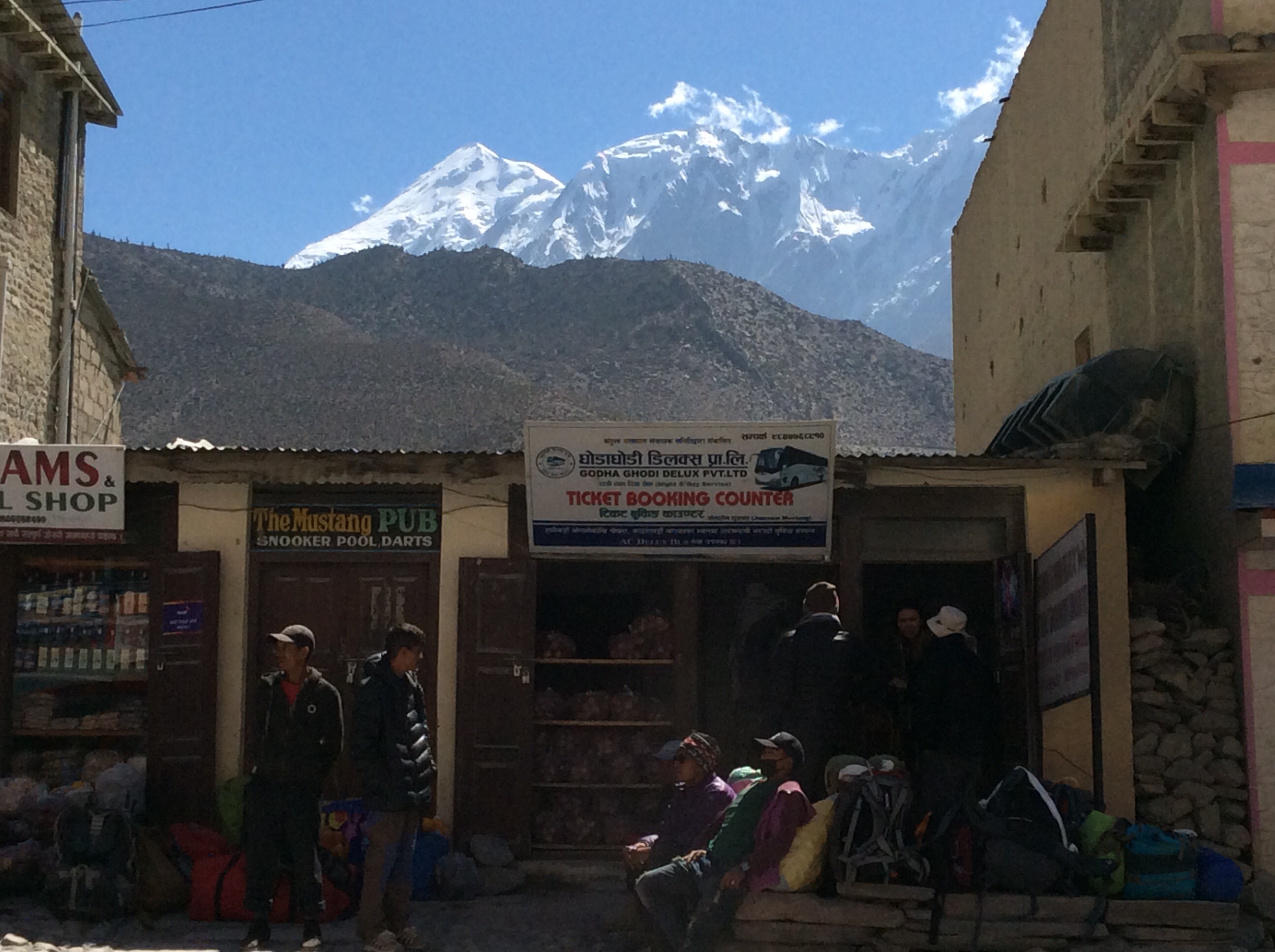 We couldn’t get bus tickets to Tatopani, despite there being several buses an hour, until a 2pm deadline, the journey being 5 hours and no buses leave when they might have to finish in the dark. The price of jeep hire escalated by the minute. There were many bus operators and we trawled the ticket booths until we found standing room only on one that left at 12.15. We pushed a reluctant Prem into buying the tickets and went for an early lunch. Then we turned up early at the ticket booth next to the Mustang Pub and Snooker Hall, with a Himalayan backdrop.
