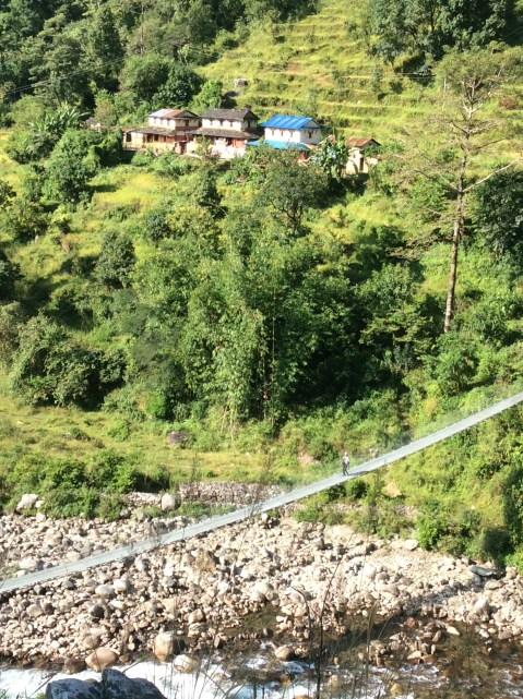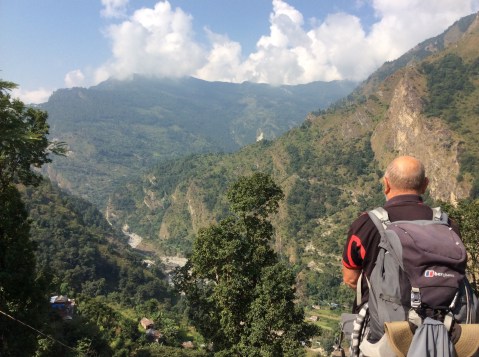Then we crossed the river on the signature swinging bridges, which have all been fantastic apart from the first one weeks ago! The climb began, up the right hand side of this valley and quite steep. Luckily the altitude was low for Nepal and we felt fit after the hard work of the last two weeks. Looking back a baldy old bloke got in the way of my photo. Ignorant get.