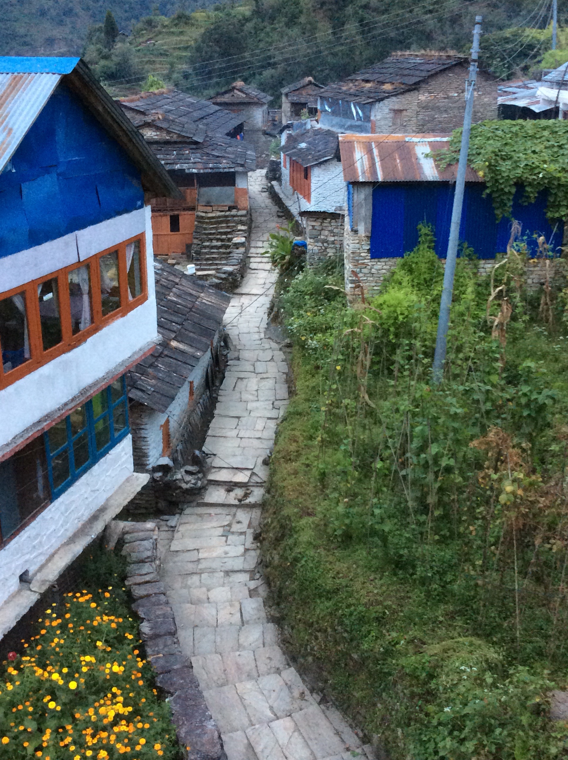 Another great breakfast and we’re off to Ghorepani. Looking up the path through the tiny village, the ancient stone rooves outweighed the currugated iron ones.
