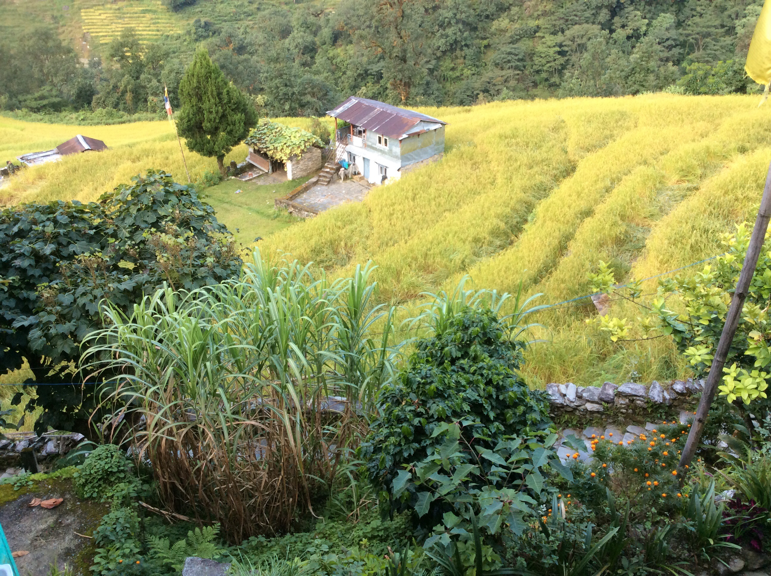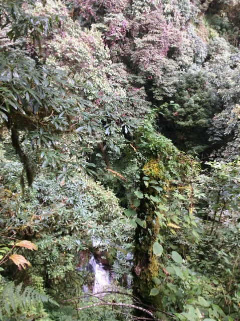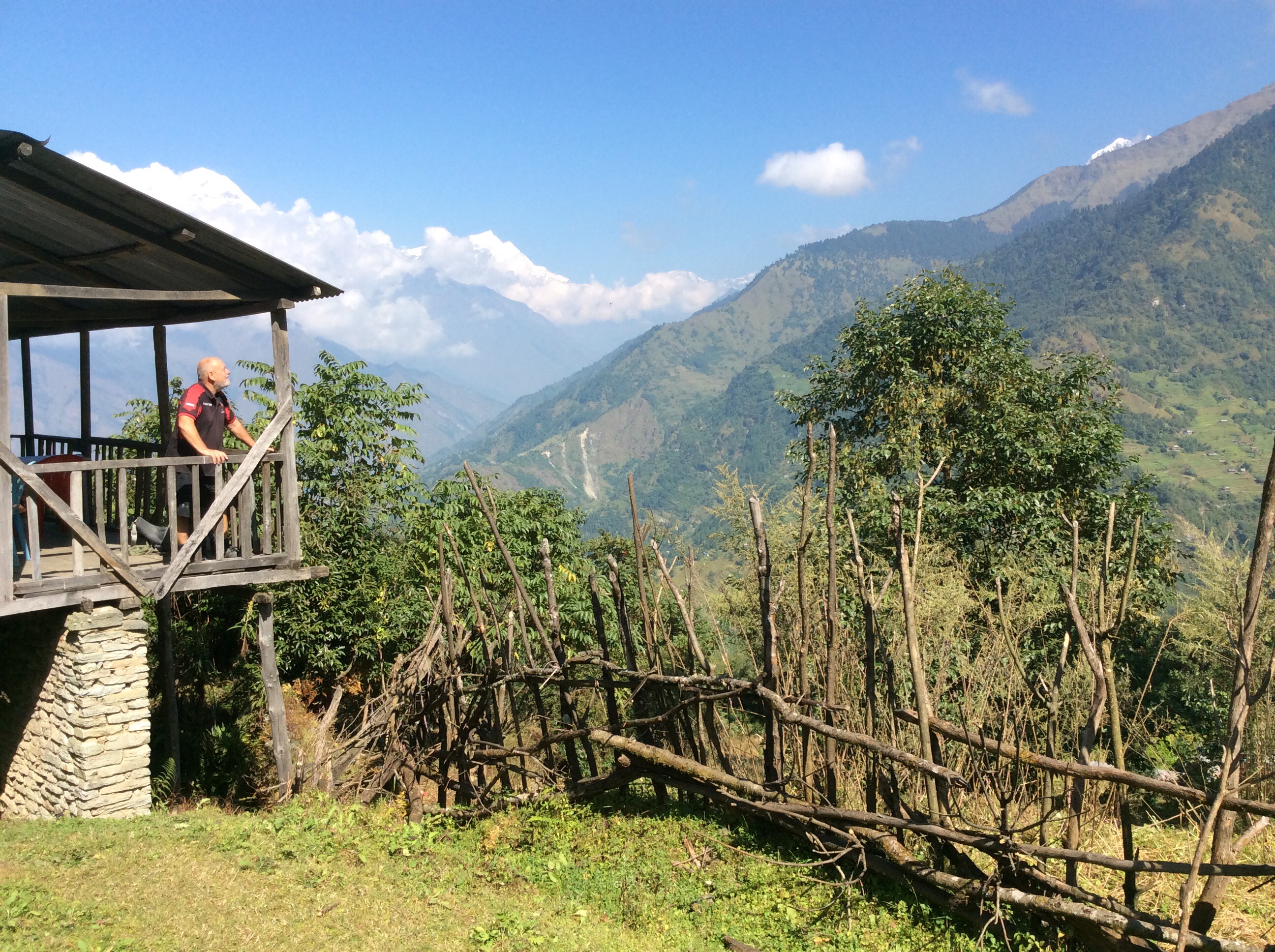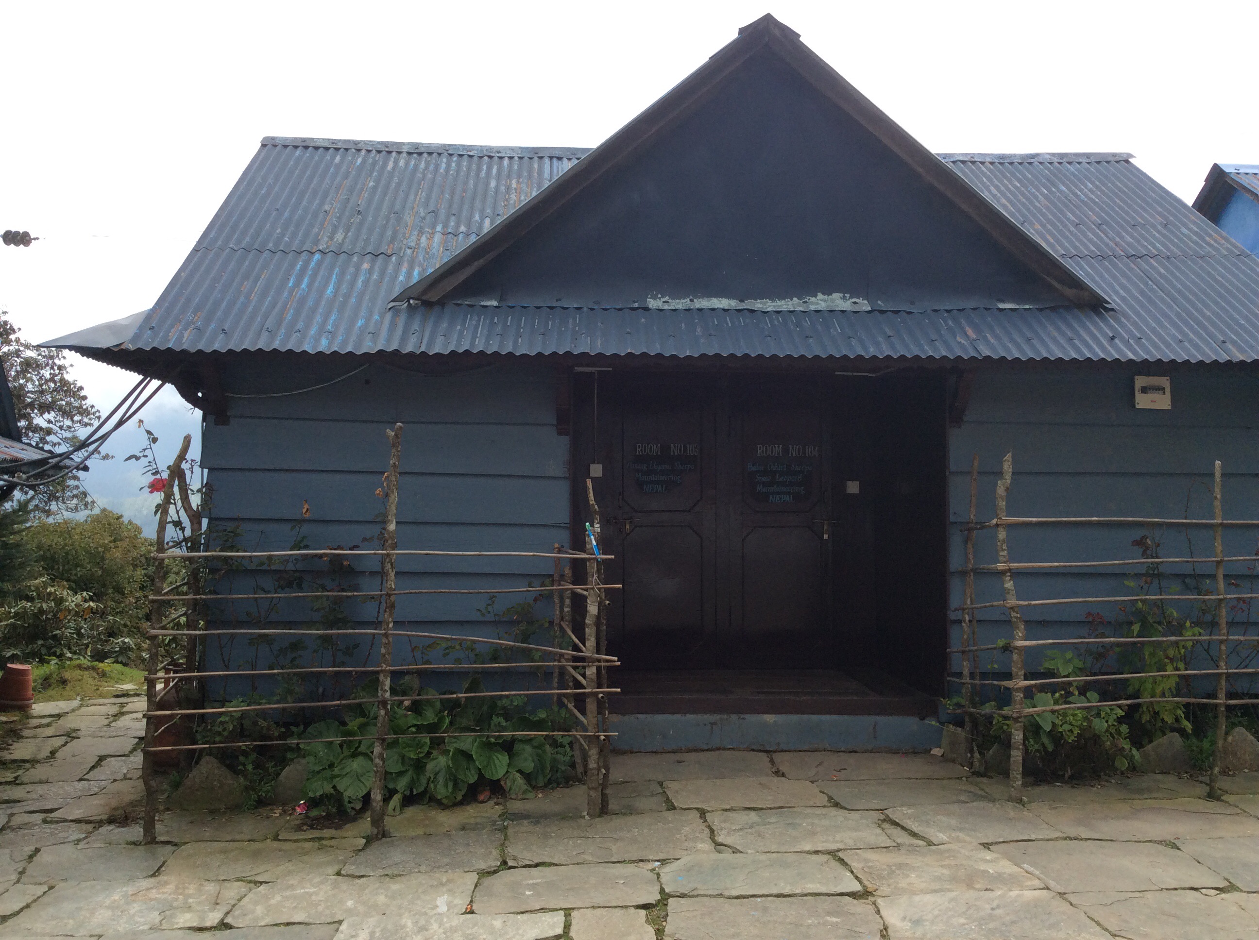 The last push was up a steep array of steps through a rhododendron forest. The national flower of Nepal. Arriving at the guest house we were delighted to have a small cabin as a bedroom. With a shower and western toilet. Result!