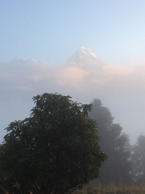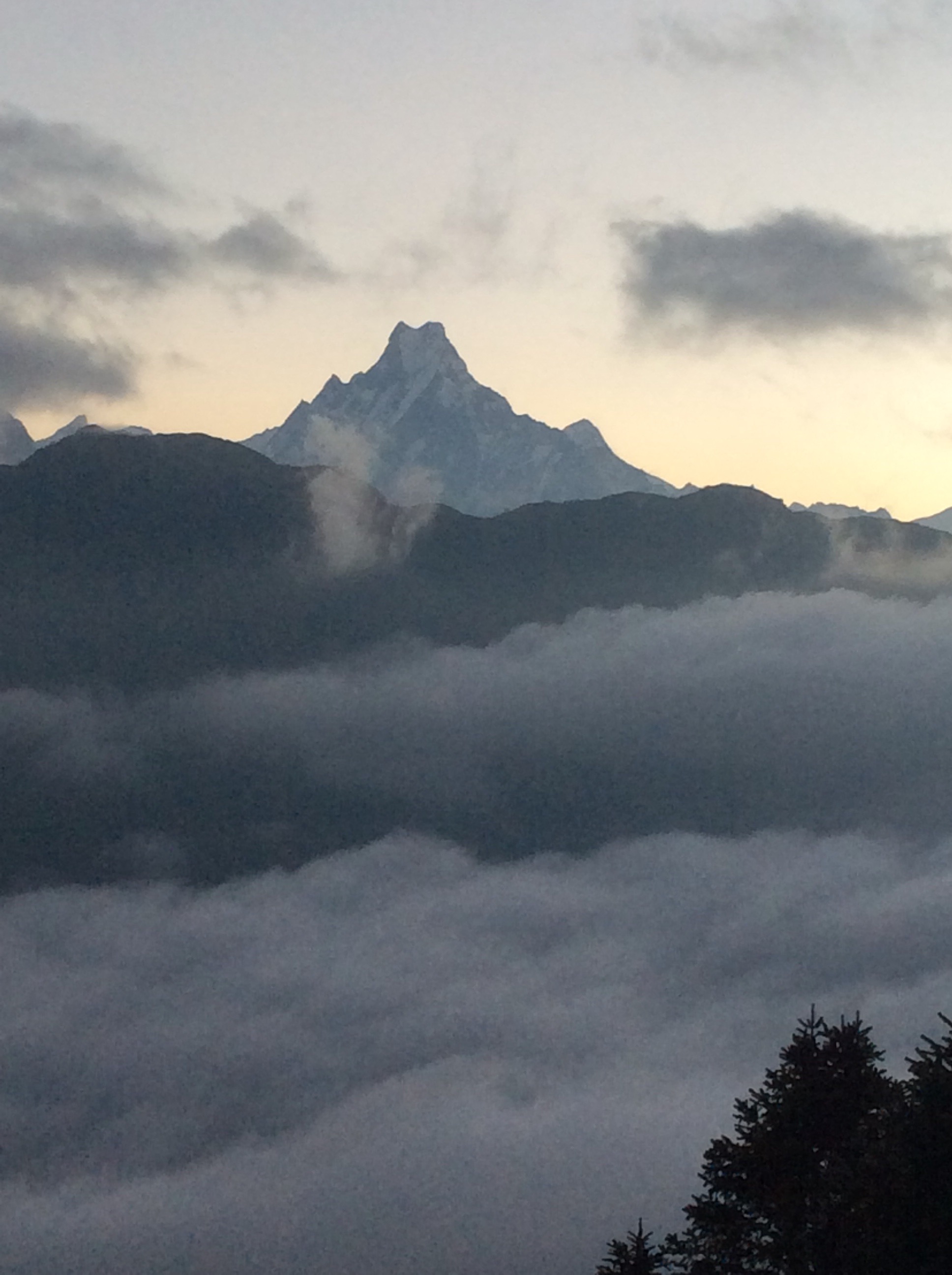 Gathered at the summit there was a hut dispensing warm tea, and the dark was beginning to break up. Around two hundred people waited in anticipation of the dawn. As the light grew it was apparent that the clouds would obscure a lot of what we were here to see. But the clouds parted to reveal the summit of Fishtail Mountain, the holy mountain of Nepal which climbers are not allowed upon.