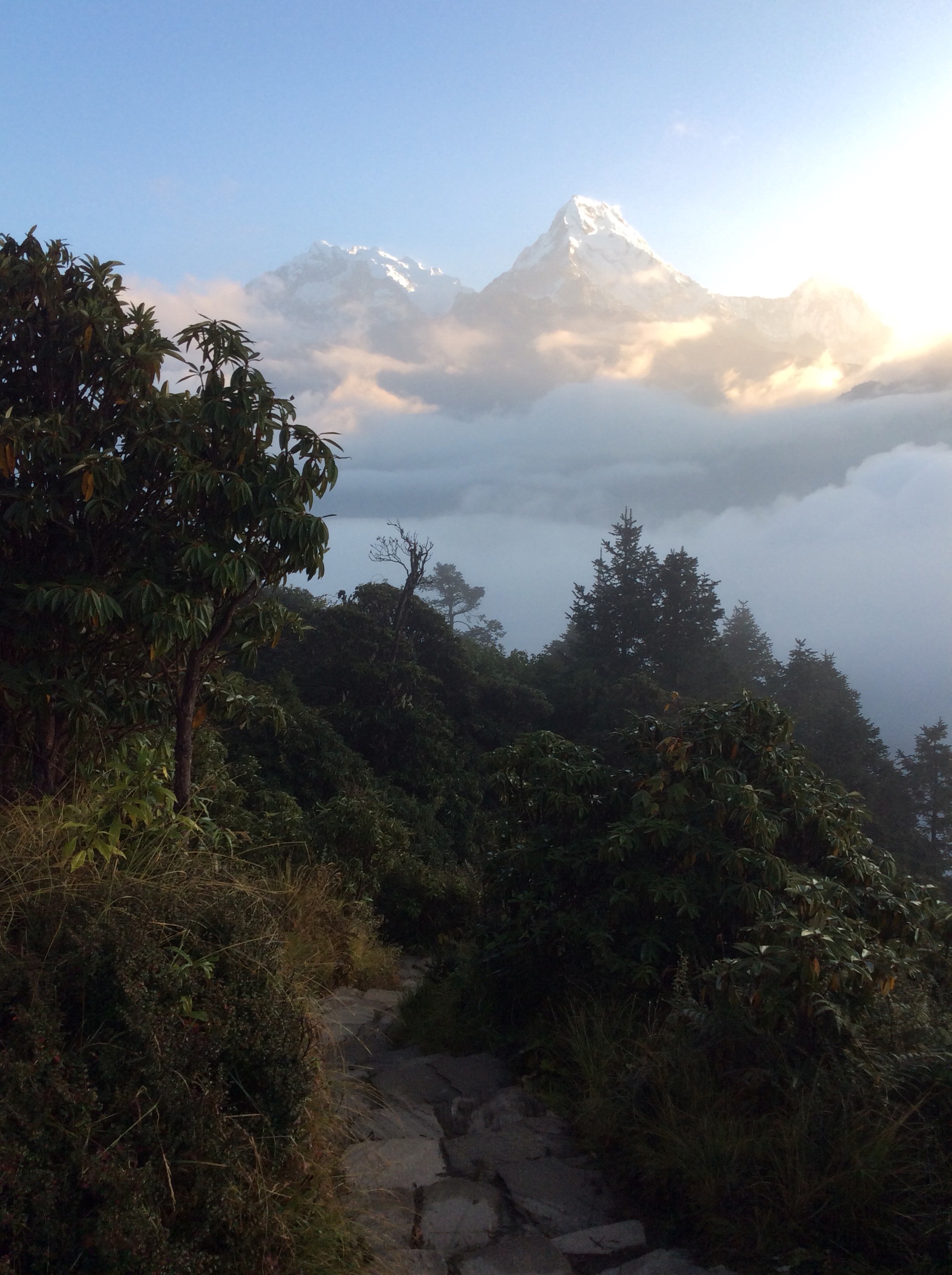 There is a vantage point at 10,500 feet, up above Ghorepani, where there is a panoramic view of the Dhaulagiri range and the Annapurna range of mountain peaks. It is called Poon Hill. Like pilgrims, people get up well before dawn, don warm clothes and head torches and climb, largely in silence, up the footpath for an hour, shedding layers of clothing on the way. Most of the way is ancient steps so the footsteps and nodding of the beam of the torch on the steps in front, surrounded by jungle, gives the climb a meaning and the participants a sense of purpose beyond sightseeing. It feels ritualistic. Let’s sacrifice somebody at the top!
