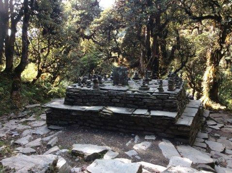 We went over the top of the pass that Ghorepani straddles and immediately started dropping down on the footpath through jungle. Hindus at work to persuade their god to grant salvation.