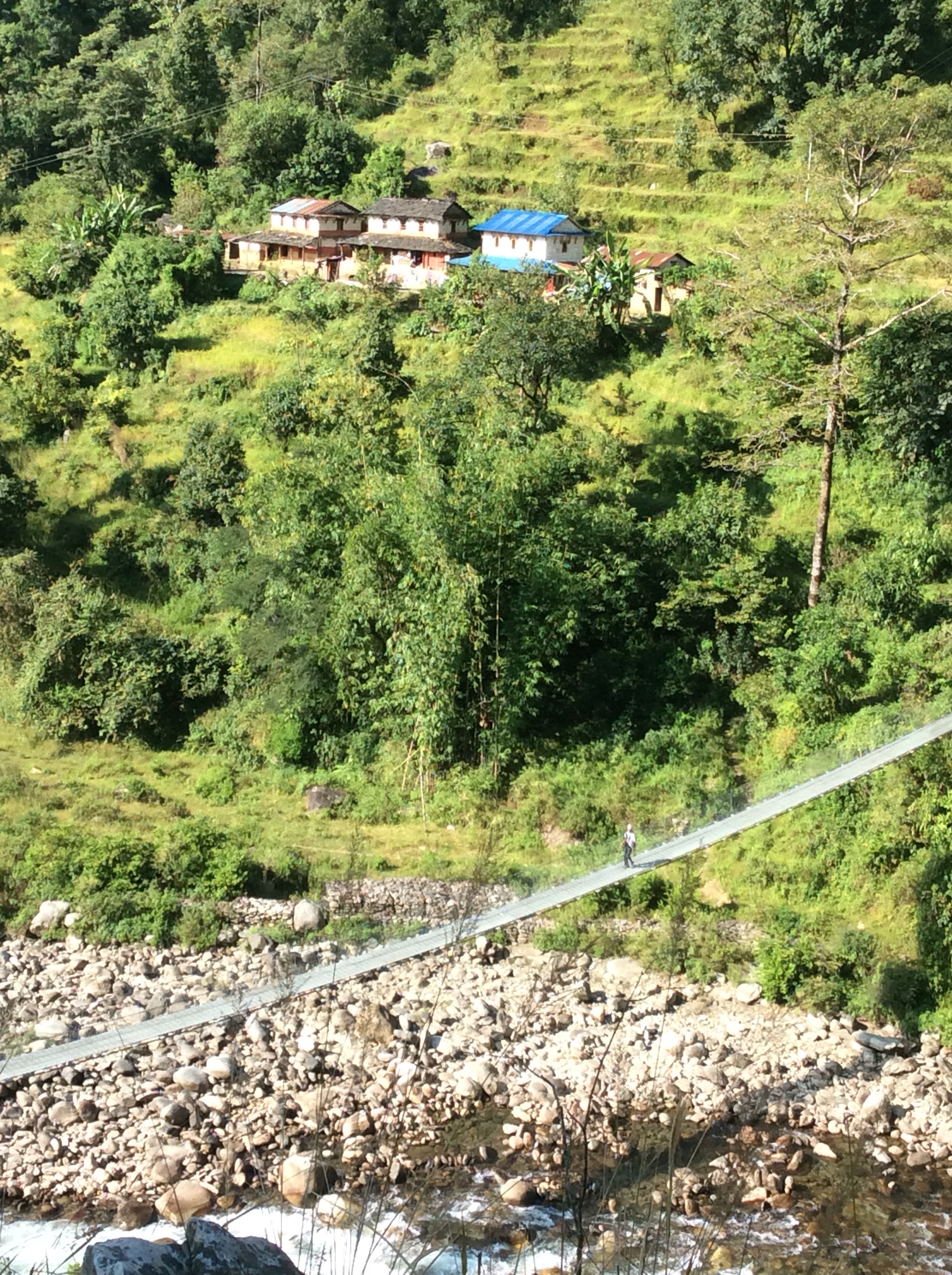 We crossed two rivers at the bottom on swinging bridges and hit upon the path on the far side of the valley, nestled in the sun, eventually leading down to our guest house in Hille.