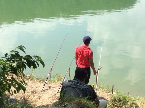 We went up on the hotel roof for a couple of hours of sunbathing, before setting off for a walk by the lakeside up into tourist town. Lads were fishing, not catching owt, and the lake was lovely.