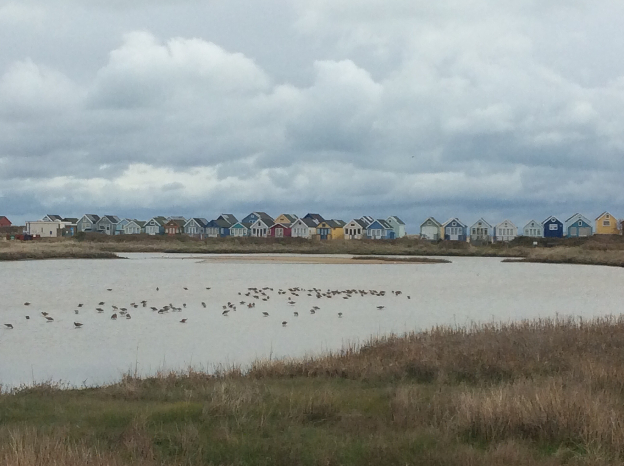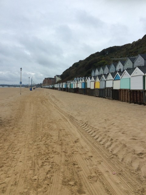 Along the full length of the sandbank were dozens of wooden beach huts.
