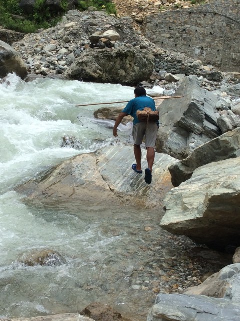 In the end the old git went barefoot and was helped across by Bhim and the mule train driver. And, having lost his dignity, he failed to regain it by wading across the next two deeper rivers in his boots. Which continued to squelch. Soft northern foot-wetter. There’s some big boulders come down here.