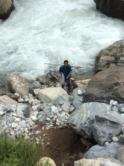 I had the squits and it seriously weakened me. I had my omelette but not my chapatis. The rain had been heavy during the night and the river which was ok for fishing yesterday was a torrent of mud. The landslides were no longer objects of interest, they were happening in the here and now and had messed up the track badly. Three people running towards us and said that we had to run as the rocks were falling. We legged it as fast as we could and looked back with relief.