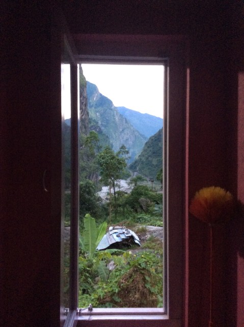 Last night I’d bumped into the owner of the tea house as I came out of the toilet, for toilet it was, full European, sit on stuff. He was shutting all the windows and generally doing the rounds. He dint speak that much English but I managed to get over to him that the view downstream from the corridor window was beautiful. He said best to get a shot of it from the top of the roof in the morning, and took me up in the dark with a torch to show me the way.
