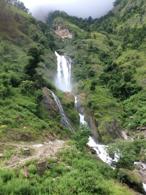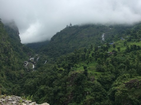 There was still a road of sorts and buses were passing us, but halfway to Soti Khola we hit the first real landslide which had wiped out the road, and they offloaded their passengers for a hundred metre clamber to a few buses on the other side. These were marooned on the short stretch of road to Soti Khola. This was becoming waterfall territory, fed by the monsoon, from which we were having a brief respite.