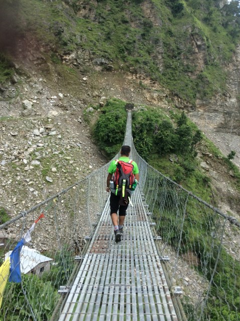 You have to cross bridges here because the path is the only way up and it switches banks to avoid solid rock walls and overhangs. The problem is when you’ve crossed then sometimes you have to climb on the path. Another bridge beat me, another climb wiped me out. Bhim tried to take both rucksacks but I wouldn’t let him. We finally made it up to a village just before 1.30pm, pulled in to the first tea house and I fell into bed.