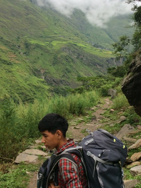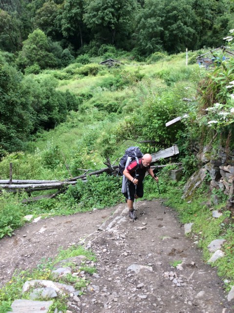 I was determined that we wouldn’t fall behind again today and asked Bhim over breakfast if he could get a porter for the day to carry my rucksack. Needs must. Whilst he was away I wandered round the garden. My clothes were hanging on the line soaked. The monsoon had struck in the night. Oh well.