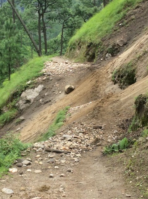 Shortly afterwards two coppers came towards us. They’d been sent up to check out an imminent landslide. They told us to be really careful if we were taking the trail. We did and we were. The fastest we could go but the trail was one mass of fallen rocks and earth. Bhim followed me, he usually leads, looking for rocks falling on to me. Looking after me. Good lad.