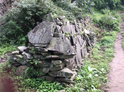 And the temperature was beginning to dip a bit, with the trees and vegetation starting to look a little alpine rather than sub-tropical jungle. We stopped for lunch and I ate without stomach pain. I didn’t feel weak and knew that I could keep going. Across the river from the teahouse was a huge wall of stone.