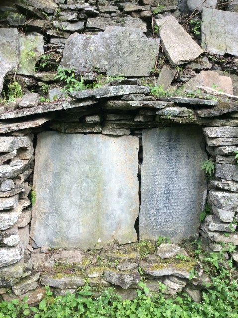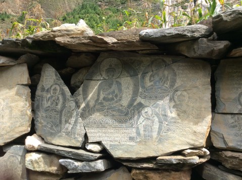 We were beginning to move into Buddhist areas. We’re less than 20 miles from Tibet, which was devoutly Buddhist before being invaded by China, and a lot of refugees had trekked over the Himalayas to seek sanctuary in Nepal. But going further back in time, Buddha was born in Nepal, although the majority of the population is Hindu. There are ancient monasteries hidden in the mountains, one a few miles higher housing 200 Buddhist nuns and 300 priests. The path passed a thick, short wall which was lined by worn but still decipherable Buddhist rock carvings. Phenomenal.