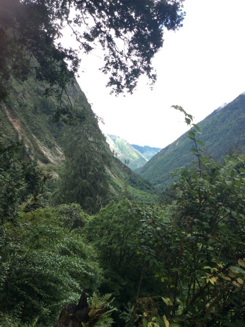 It was a good night in the room but the monsoon had been strong. I’d hung my wet clothes from days ago up on the balcony and the wind had whipped the rain under the eaves and soaked my clobber even more. This was followed by breakfast consisting of milk tea, without tea, and noodle soup laced with salt until it was inedible. Unperturbed we set off and I got my rucksack on my back without too much difficulty. The valley up ahead was dark and cloudy. Who gives a fig, we’re going to the top.