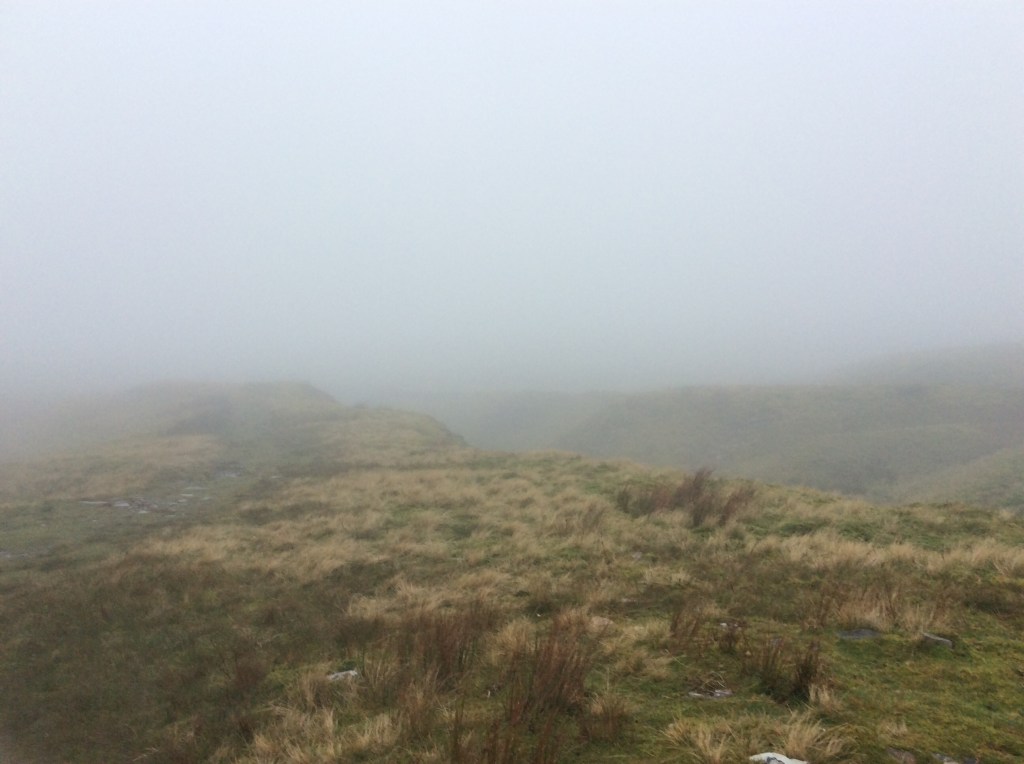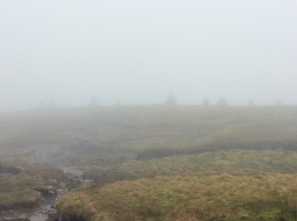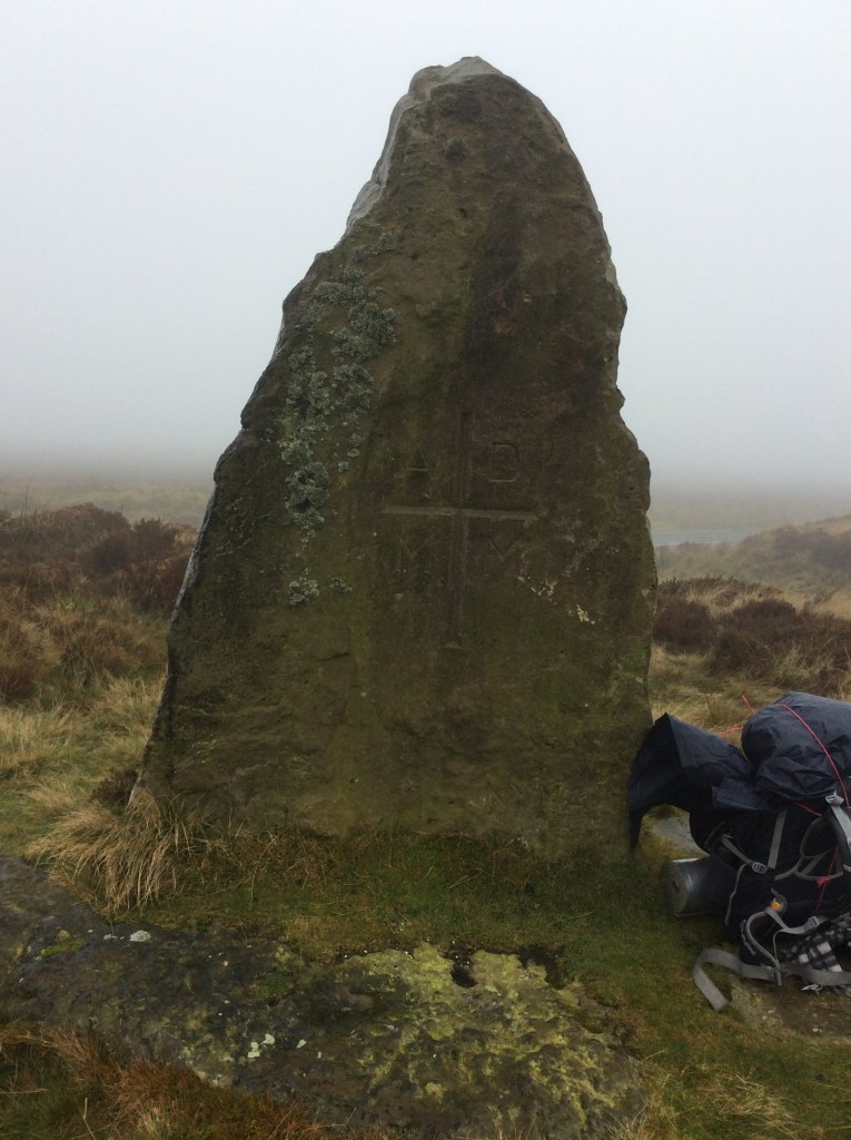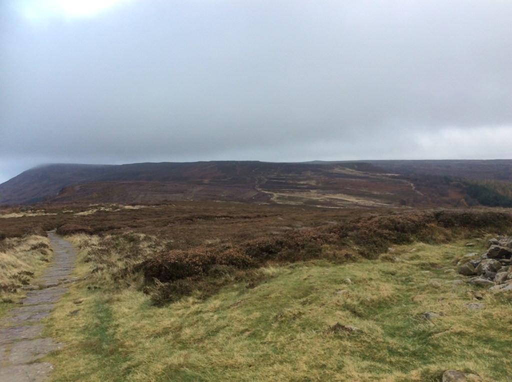 This was a 15 mile walk today and the first 9 miles were over the Moors in the rain and cloud and wind. I was wet, and wanted to sit by a fire drinking hot chocolate. But when you’re Miles from Nowhere, thanks Cat, all you can do is walk. When the cloud lessened temporarily there wasn’t much to see anyway.