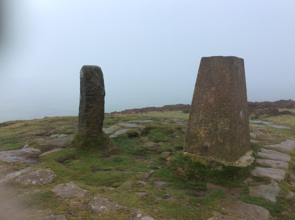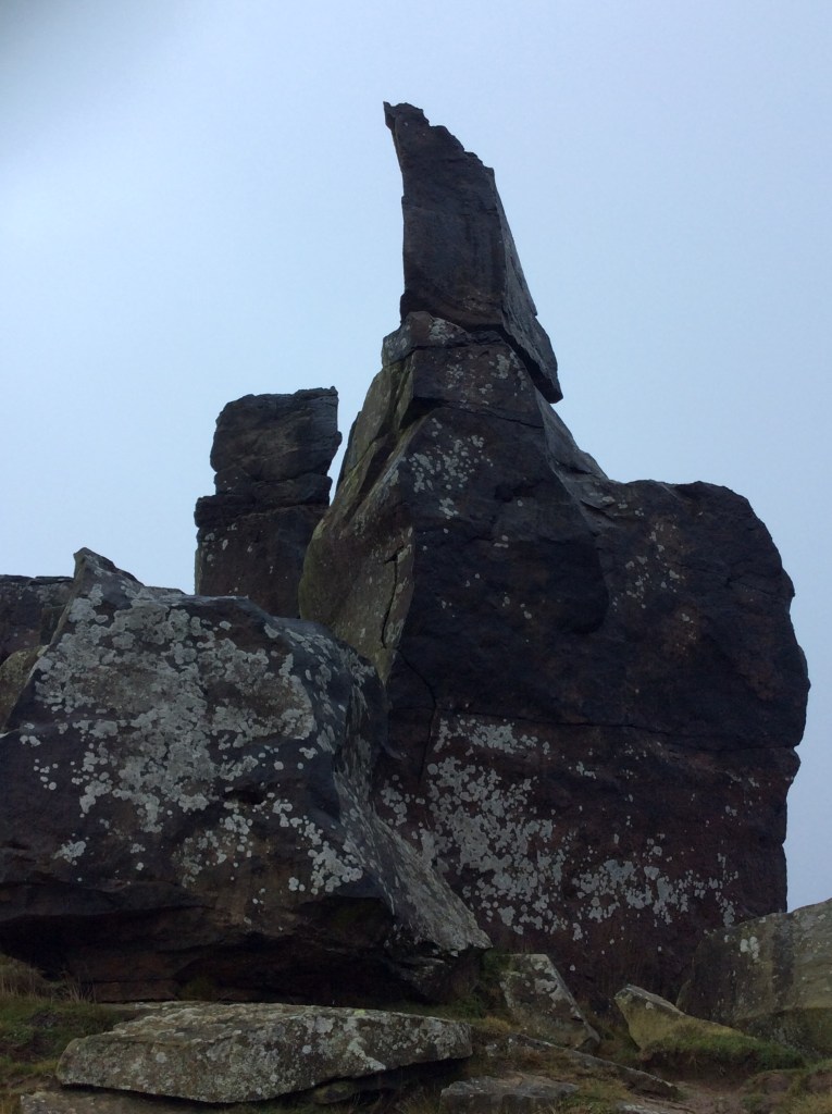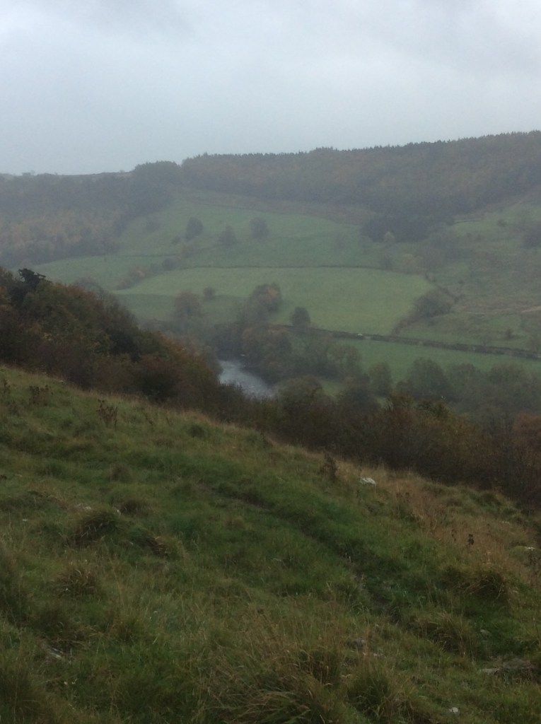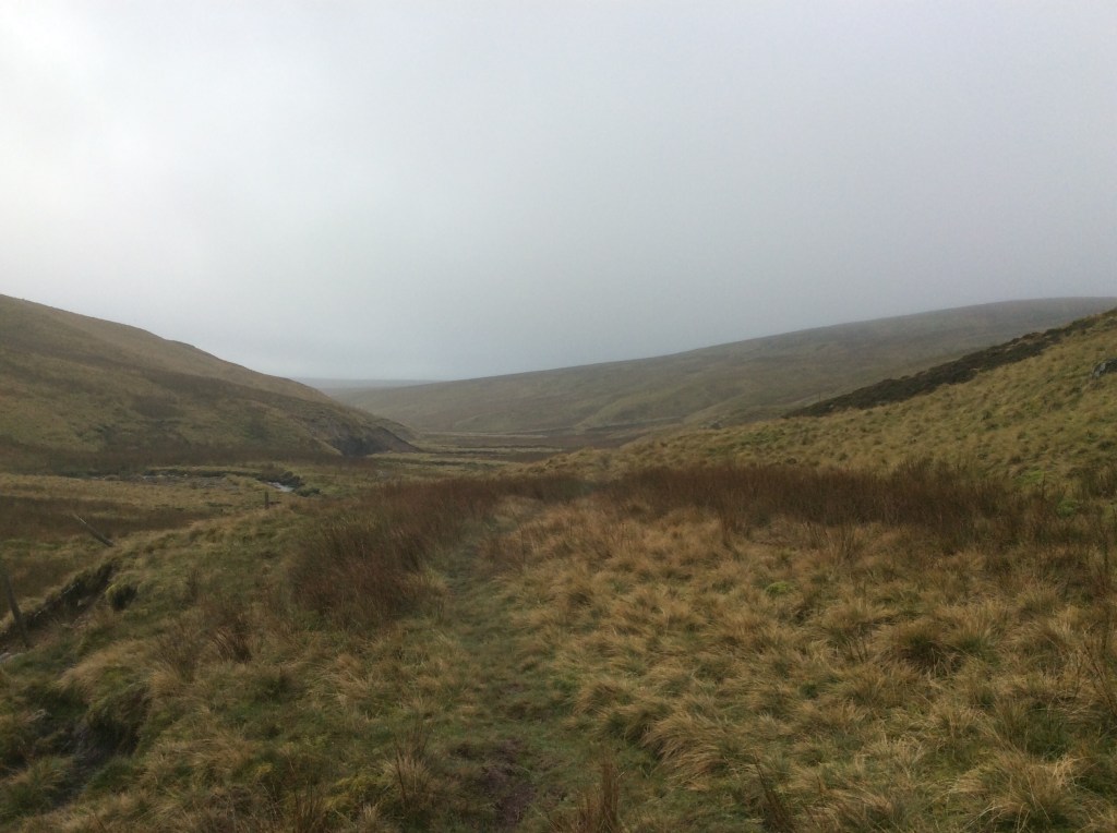 This was a 15 mile walk today and the first 9 miles were over the Moors in the rain and cloud and wind. I was wet, and wanted to sit by a fire drinking hot chocolate. But when you’re Miles from Nowhere, thanks Cat, all you can do is walk. When the cloud lessened temporarily there wasn’t much to see anyway.