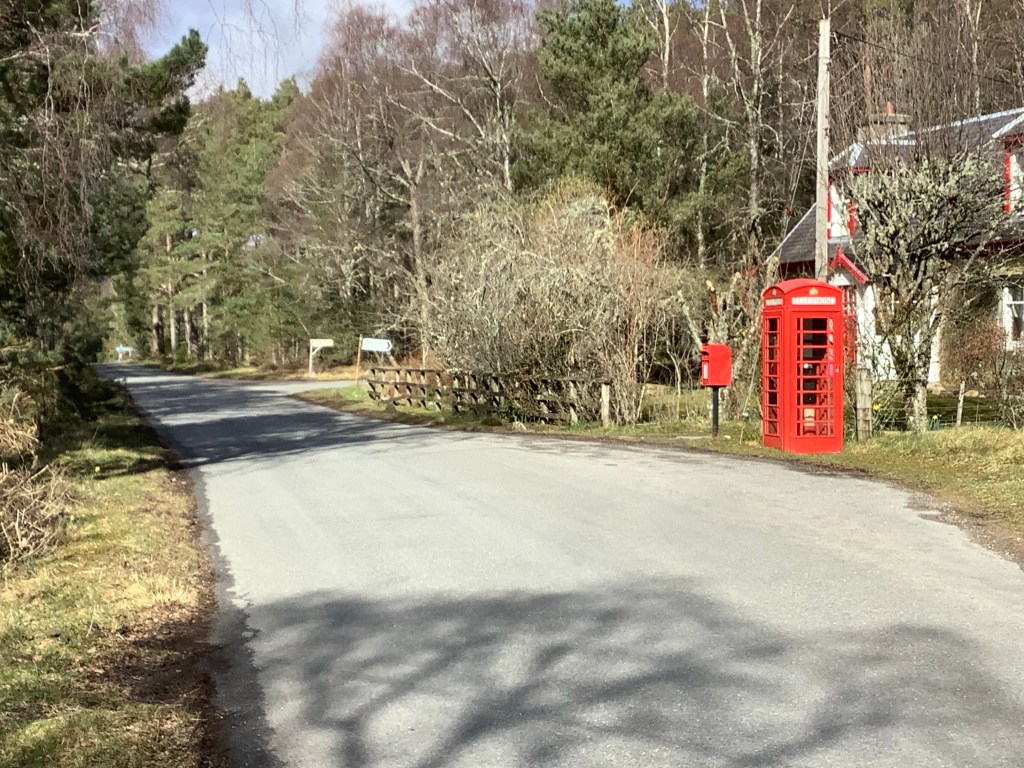 Nearly 50 years ago I was on holiday here with Maggie and my sister Deborah one Easter. We drove down this dead end road to Glen Feshie and my old Morris Minor packed in during a blizzard. I told the girls to stay safe and I set off to find a phone to call the RAC. This is the phone box I used all those years ago. I just couldn’t understand the woman from Inverness at the RAC centre there, it was so strong an accent that it was like a foreign language. I gave up and was walking back to the car when I heard it coming down the road. Maggie had kept trying to start it and had succeeded. She didn’t know how to drive but managed to get it moving in first gear and drove two miles down the Glen in first. What a catch!