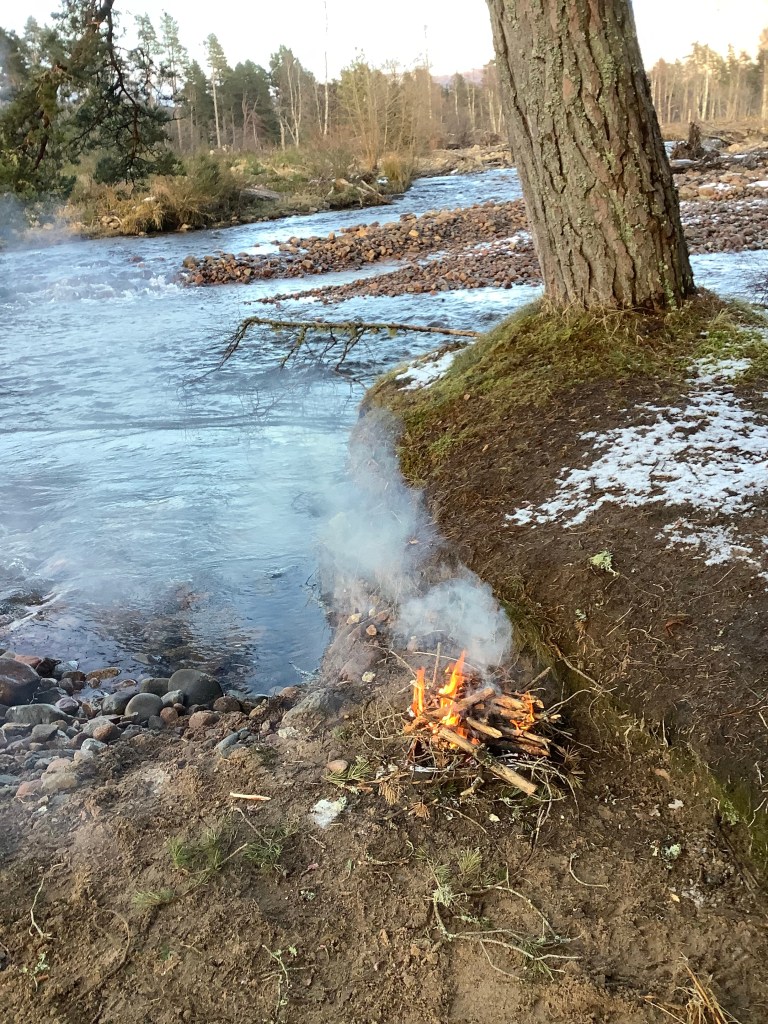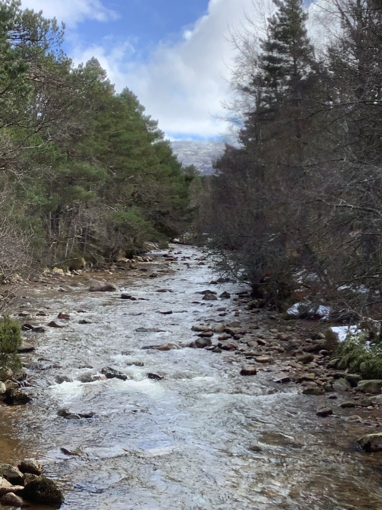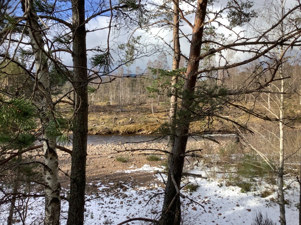 The snow was still heavily on and off but I knew there was a river behind the hotel with a shoreline under trees where a bbq could be protected from the wind and precipitation. Looking the other way, in the direction of my next stage through the Lairig Ghru, it looked a bit dodgy.