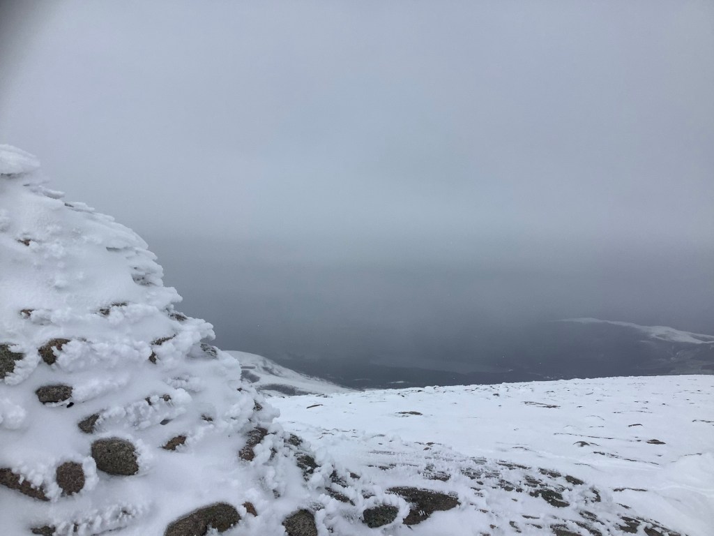 The last half a mile was really exhausting as the snow got deeper and the slope got steeper. It was starting to snow again as I reached the cairn marking the top. And the world was white.