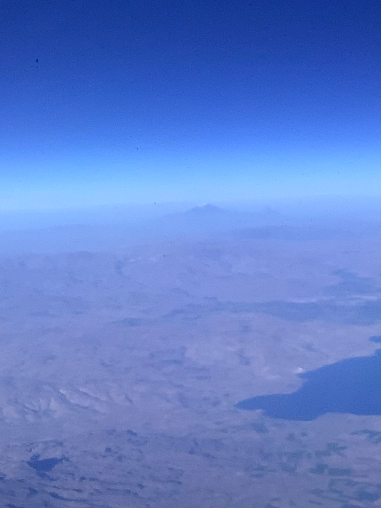 The flight today over to Abu Dhabi was great. I’m meeting David in Kathmandu so I was on my tod but I love flying – although it’s frowned on by some folk due to the environmental impact, and I’m sure that we will witness first hand the effect on Nepal. Particularly the glaciers that we will be climbing over. They is shrinking fast, sadly. This shot below is from the plane from eastern Turkey over to a mountain in northern Iran. The small crest of snow, which is barely visible, would have covered much more of the peak a few years ago.