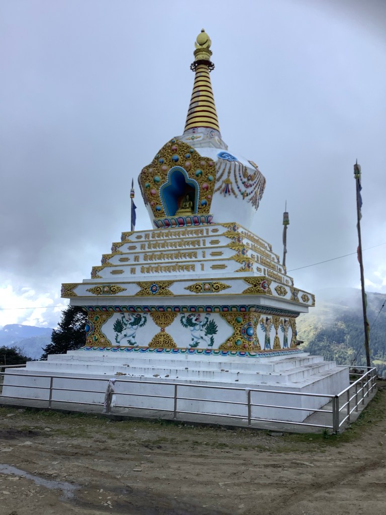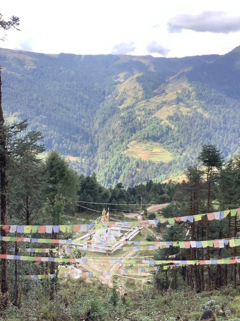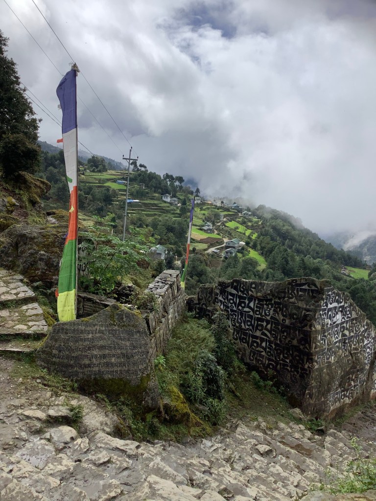 The first peak today was marked by a stupa, and down below on a ledge of the valley was another, bedecked by prayer flags. What a sacred sight.