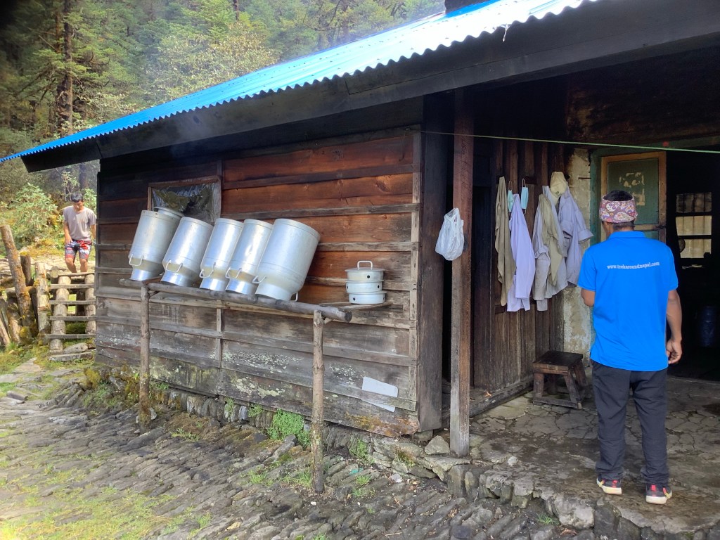 Only to rise and fall, the final fall for the day, down to Junbeshi. We had slogged again for another 9 hours and were relieved to see a pleasant tea house with a pleasant woman owner, clothes washing facilities under a pipe from a mountain stream and drying facilities around a log burning megastove.