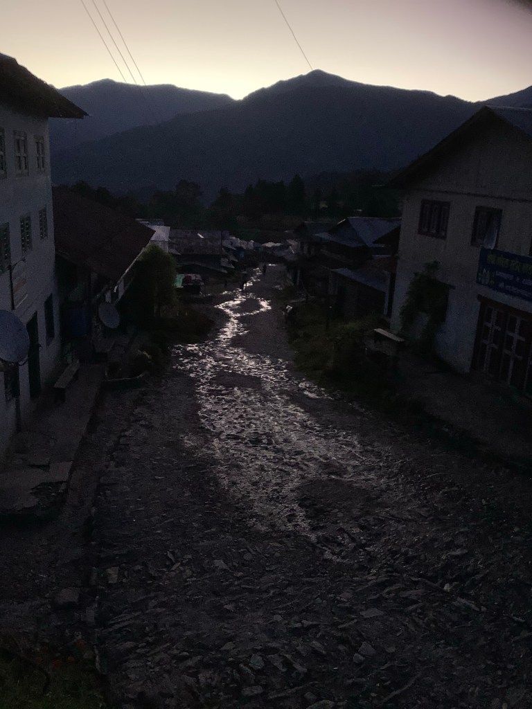 As we ate dinner we could see, in the darkness, dozens of people walking down towards the village with their head torches shining. As they arrived they were turned away. I was sorry for them, but an elderly group of Americans from Wisconsin, who had been very depressed outside the tea house when we arrived, were allowed to sleep in a group on the floor of the tea house restaurant. At least they had shelter. It’s harsh up here.