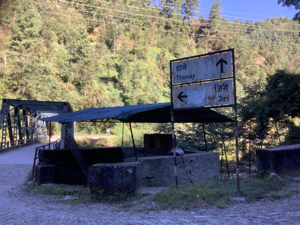 The road started with a marathon climb up a very steep hill, followed by a marathon drop. It lasted for three hours. Bouncing over boulders. Then we reached a turning in the road, signposted to Jiri. Hooray! We disembarked and walked a way down the Jiri road.