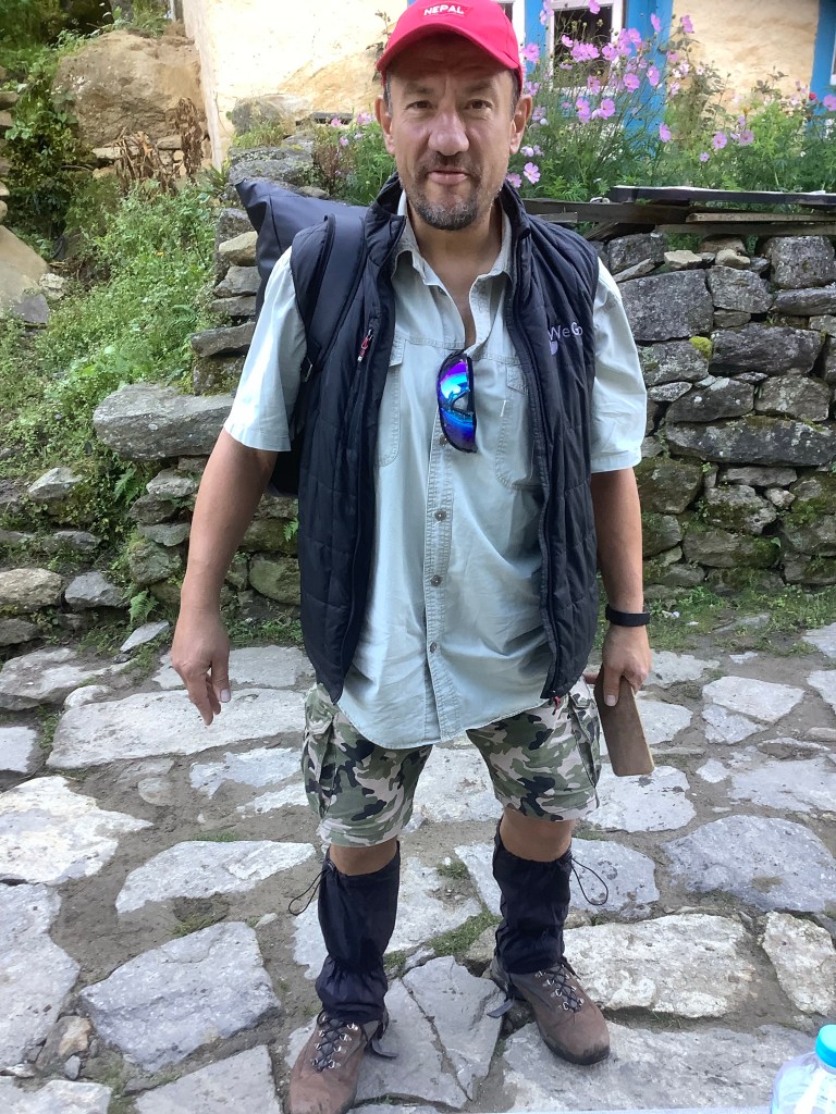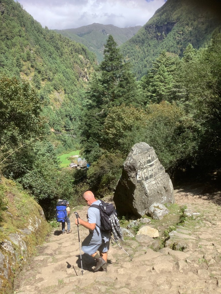 Well it’s going to be a long slog today, climbing three thousand feet over 7 hours up to the biggest village on our route, Namche Bazar. We had an early breakfast and early start, setting off at 8am. Senor Kilby was well prepared for all elements, sun, rain and calf-biting mosquitos.