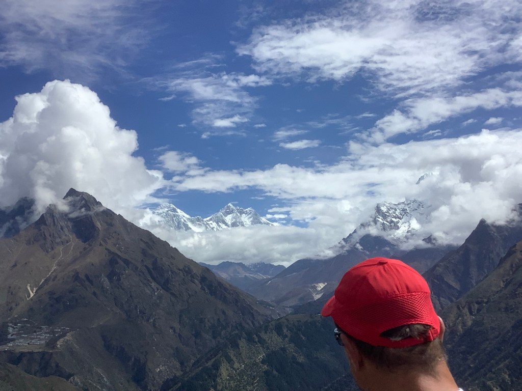 At the top of the hill we walked for half an hour along the ridge away from the village to a vantage point and – there was Everest in the distance to the left of Lhotse. An awe inspiring moment.