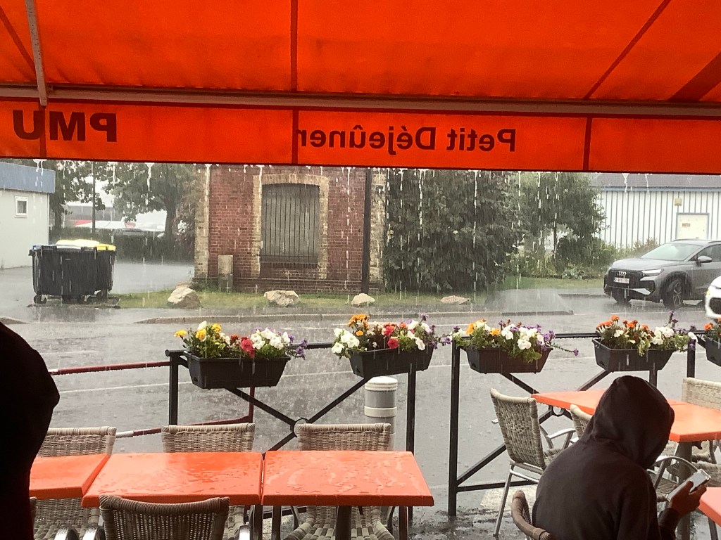 But then the storms came. I legged it across the rest of the bridge and off to a side path leading to a backroad. It was relentless and I had to take shelter under a big beech tree. The rain intensified so much that it came through the leaves, dripping on to me, and began to stream down the road. I covered up my rucksack, got my wet weather gear on and took off, but it got through the slightest of gaps in my armour, and pierced my goretex walking shoes. I made it to the main road in to Honfleur, and all the cars were stood waiting for the rain to ease. Eventually it did, I managed to get my iPad out and booked a cheap hotel. Tents aren’t good in these conditions! And after a great duck Parmentier in a local PMU I’m back in my hotel. I didn’t think I’d get out of the PMU!