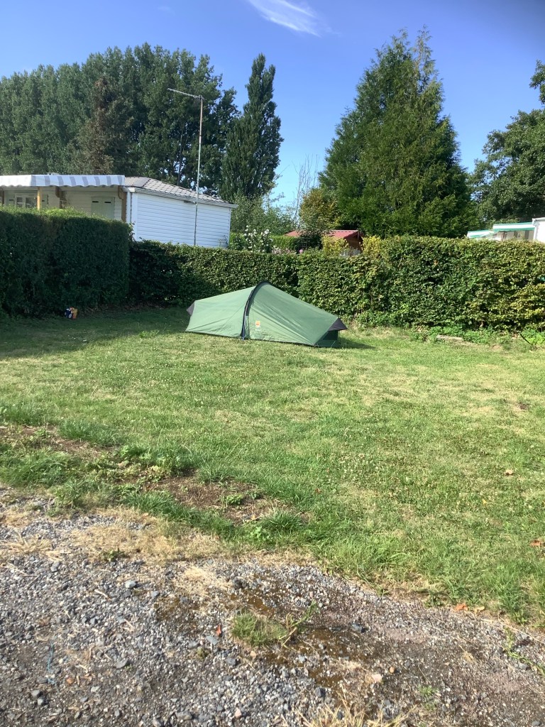 The rain continued to the extent that I wasn’t sure if I could get my tent up at the local municipal site. Then it quietened down for a while, and I legged it round there and put the tent up underneath a high hedge and some trees. A very quiet site, just me and two others. Nobody in reception but I’ll pay in the morning.