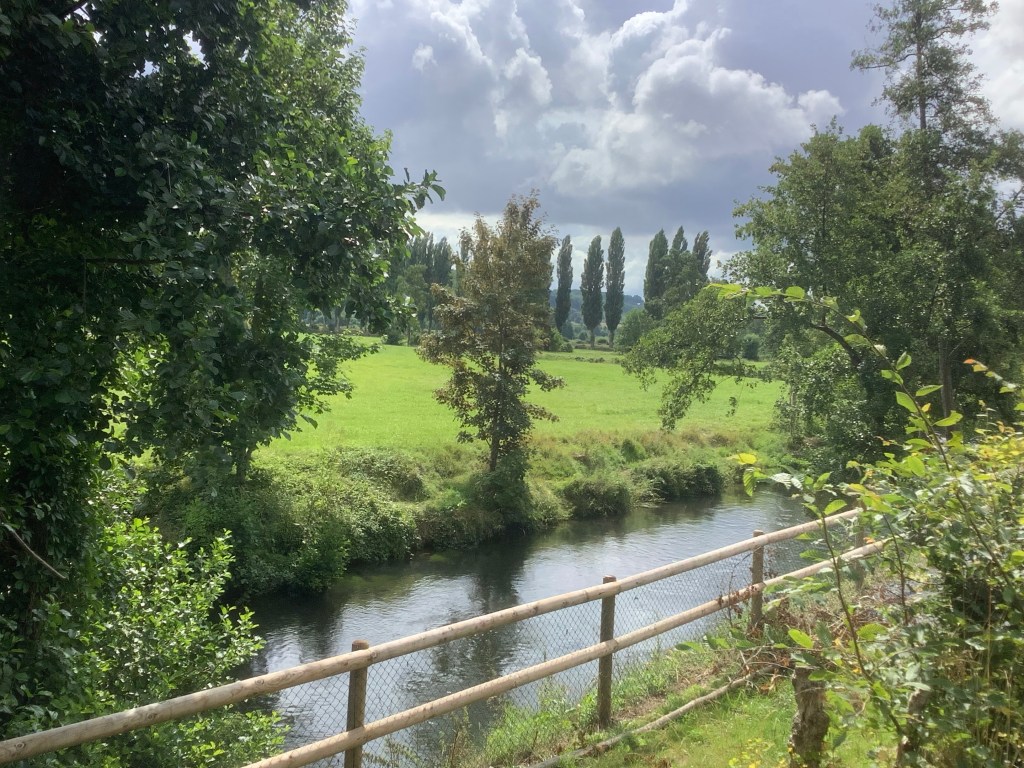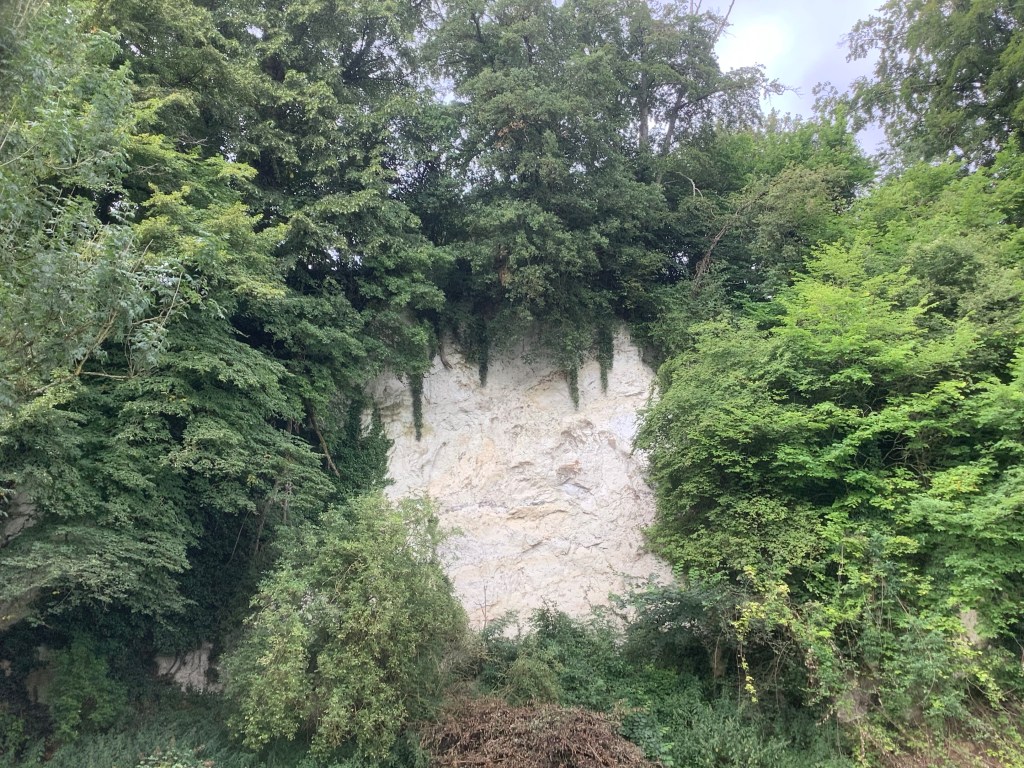 The route was direct, straight up the valley by the side of the River Auge. Quite busy initially but then easing off. These road walks are a mixed blessing. You can get places fast on a flat surface, but it’s not always picturesque, like country footpaths always are. A chalk cliff, but it was quite hard, almost limestoney. There’s a Neanderthal cave lurking in that greenery somewhere, I’ll be bound. A lot of me being bound on this trip. We don’t have that kind of thing in Yorkshire.