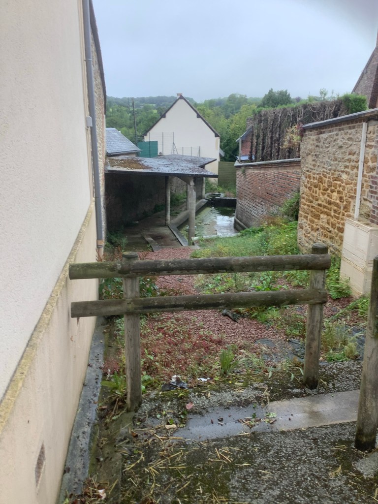 After the tank the rain got worse and there were no trees at the side of the road, so I changed my plan. I found a road off to the left, past nice houses, that dropped down into a valley running up to Gace.