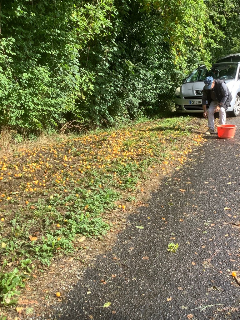 With only a pain au chocolat on board I began to feel peckish. An old gimmer came along, stopped his car and began collecting up these yellow plums, just like in my front garden. I got tucked in, they were sweet and delicious. He said he was collecting them to make jam. Good shout.